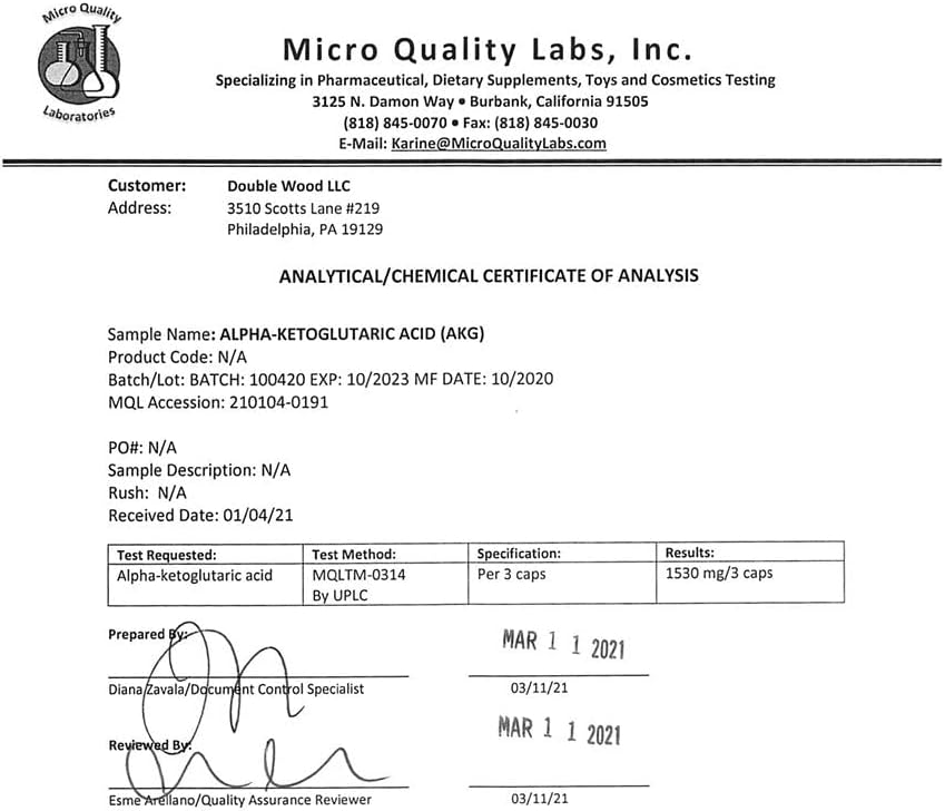 AKG (Alpha-ketoglutaric acid) 1000mg, Gelatin capsule, rice flour, microcrystalline cellulose