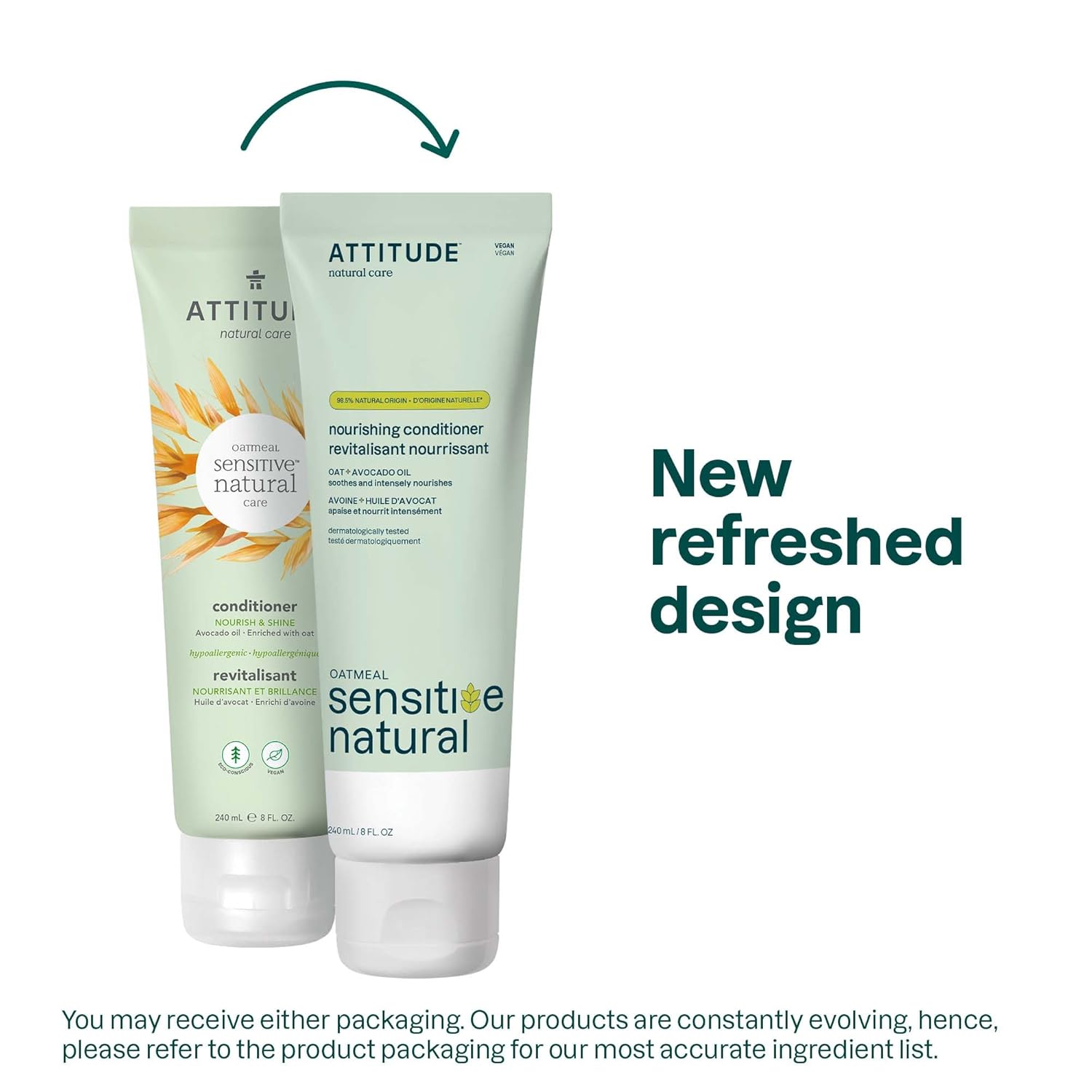Care for your hair and scalp with ATTITUDE Sensitive Natural Conditioner – Nourishing. Made with 98% natural origin ingredients¹, this conditioner for dry hair is crafted to provide gentle daily care—free from silicones, SLES, and other additives that can irritate sensitive skin or sensitive scalp. Infused with avocado oil to nourish and help retain moisture, and oat extract to soothe dryness, this conditioner for women and men leaves hair soft, smooth, and comfortable from root to tip. Pair with our Sensitive Natural Nourishing Shampoo and it's the perfect match for those looking for a sensitive shampoo and conditioner or a complete sensitive skin shampoo and conditioner set. Part of our Sensitive Natural collection, this certified vegan formula supports a clean beauty routine and complements other care options like conditioner curly hair, conditioner for men, or travel shampoo and conditioner sets. Lightly scented with a crisp Fresh Apple fragrance balanced by herbal rosemary, it offers a refreshing finish without overpowering. A great fit for clean, nourishing care routines for both women and men.