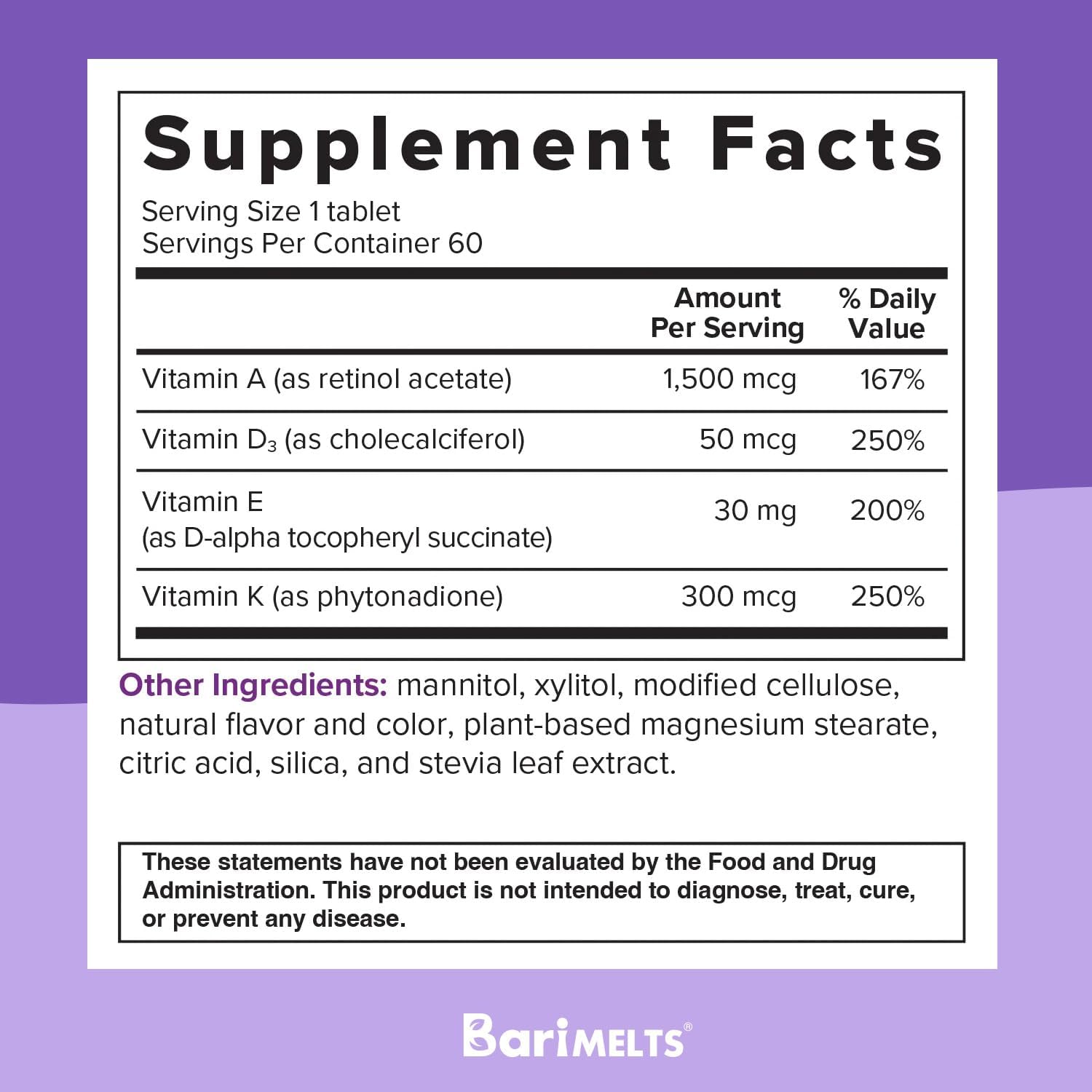 - FAST DISSOLVING, GREAT TASTING: Fast-dissolving, great-tasting bariatric ADEK! Many patients require higher doses of Vitamin A, Vitamin D, Vitamin E and Vitamin K than are typically found in bariatric multivitamin formulas. We designed our BariMelts ADEK to meet these needs.