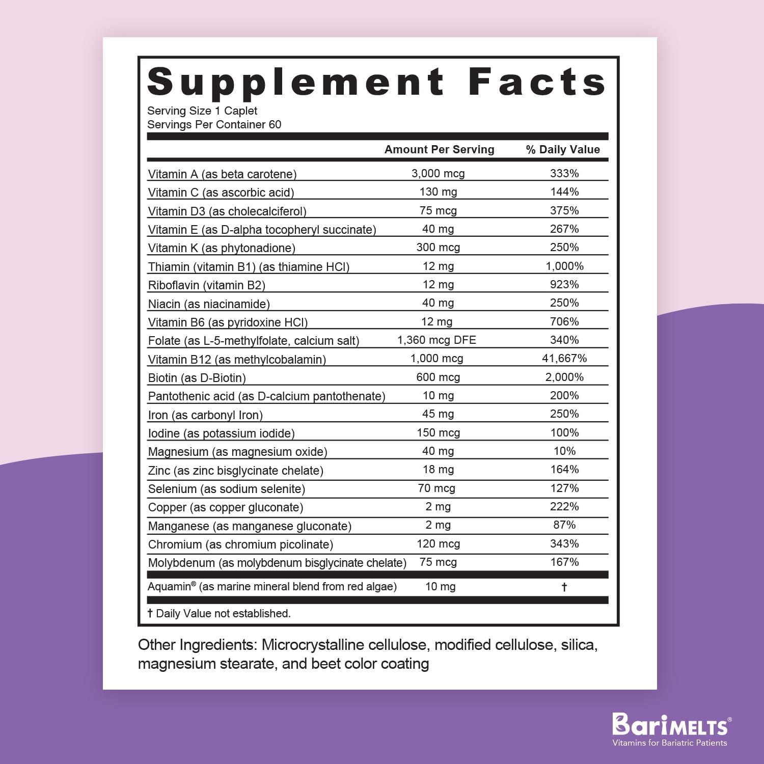 Suggested use: Take 1 caplet per day; specially designed for post-bariatric patients looking to transition from hard-to-swallow pills, capsules, and chewable vitamins