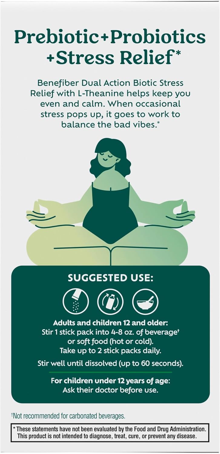 Benefiber Dual Action Biotic plus Stress Relief (1) is a perfect way to support your digestive health in an easy to take format that works with your schedule. This dual action plant-based fiber combines prebiotic fiber and probiotics to help optimize gut health and also contains L-theanine to help calm and destress (1). This prebiotic fiber powder with probiotics comes in convenient, pre-measured stick packs that are perfect for taking on-the-go. These stick packs add to and nourish the good bacteria in your gut, helping support an environment for good digestive health (1). This gluten free prebiotic dietary supplement with probiotics can be mixed into your favorite foods and non-carbonated beverages like water or juice, so you can enjoy all the benefits of this soluble fiber supplement in your favorite foods and beverages. Use this fiber powder supplement as directed to support your digestive health (1). A healthy gut is a healthy you. (1) These statements have not been evaluated by the Food and Drug Administration. These products are not intended to diagnose, treat, cure or prevent any disease.