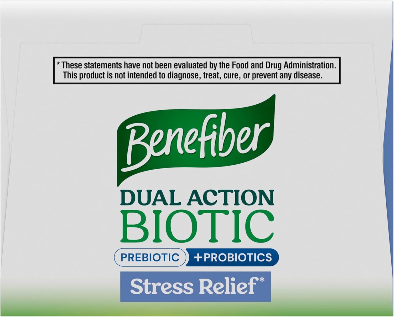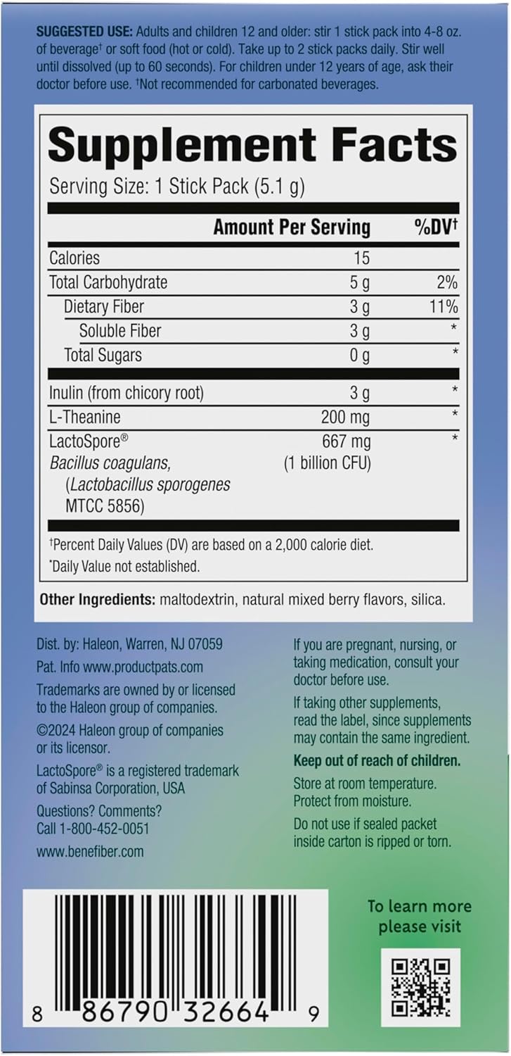 - One 18 count package of Benefiber Dual Action Biotic plus Stress Relief (1) Stick Packs - Hint of mixed berry flavor; Helps Relieve Occasional Bloating