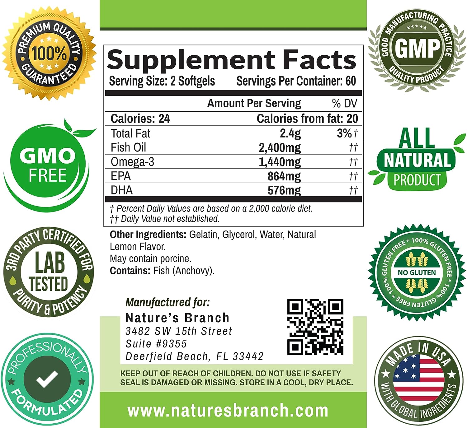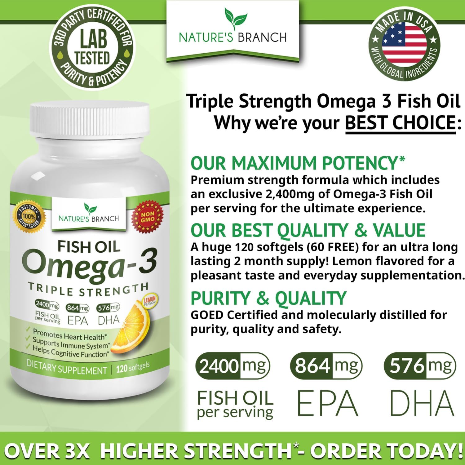 - ✅ THE BEST PREMIUM OMEGA 3 FISH OIL CAPSULES - The highest concentrate, 2400mg triple strength, molecularly distilled premium Omega 3 softgels delivering ESSENTIAL FATTY ACIDS in every serving with 120 lemon flavor, burpless capsules in every bottle.
