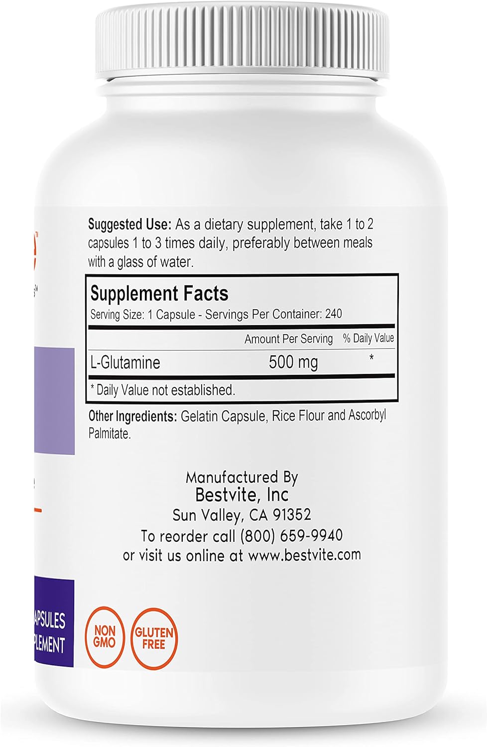 - PURE FORMULA: Bestvite L-Glutamine contains no stearates, is non-GMO, gluten-free, and comes in an additive-free capsule. Each capsule contains 500 mg of L-Glutamine.