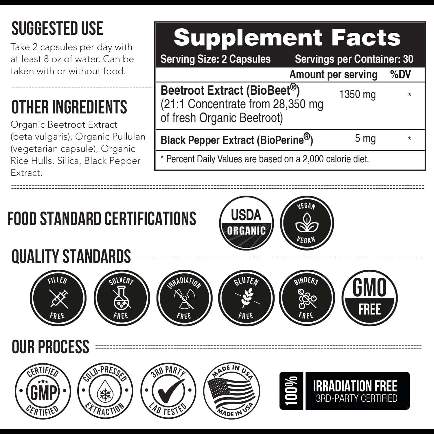 • QUALITY YOU DESERVE: All our products are produced in cGMP certified facilities following the most rigid organic and quality standards. The product is vegan, GMO-free, derived from organic ingredients, free of solvents, fillers, binders, artificial ingredients. Each batch is 3rd party tested for purity and potency.biobeet capsule