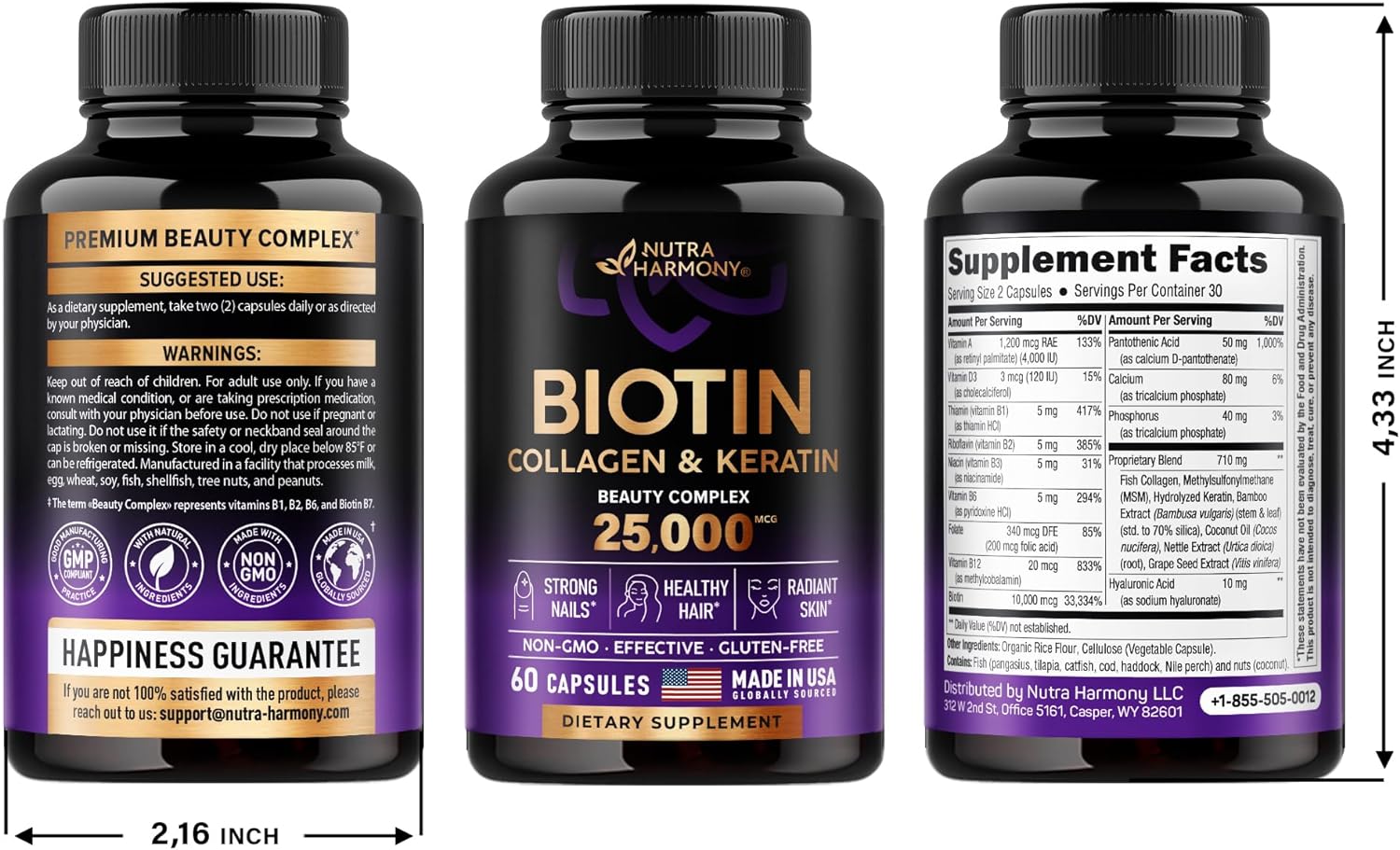 - Biotin with Hyaluronic Acid & Collagen Supplement — The Nutraharmony biotin supplement contains potent Biotin, Collagen, Keratin, and other essential nutrients that naturally support your health and beauty. Take two capsules a day with our highly bioavailable formula that promotes fast and proper absorption. Take care of your skin.