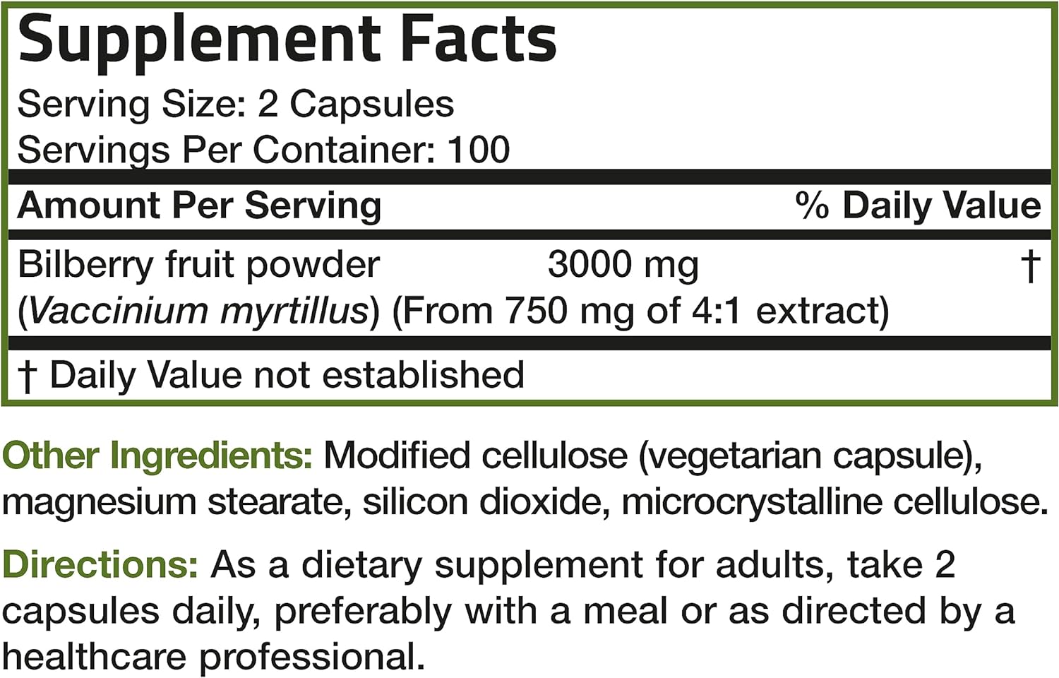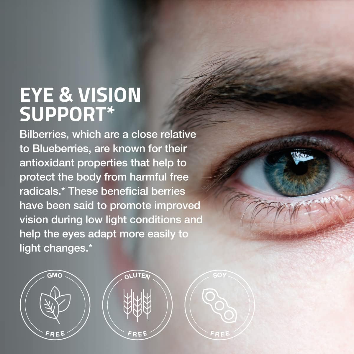 - Extra Strength Formula: Bronson Bilberry provides 3000 MG of Bilberry Fruit per serving (from 4:1 extract) to help support eye health and overall vision.* Bilberries, which are a close relative to Blueberries, are known for their antioxidant properties that help to protect the body from harmful free radicals.*