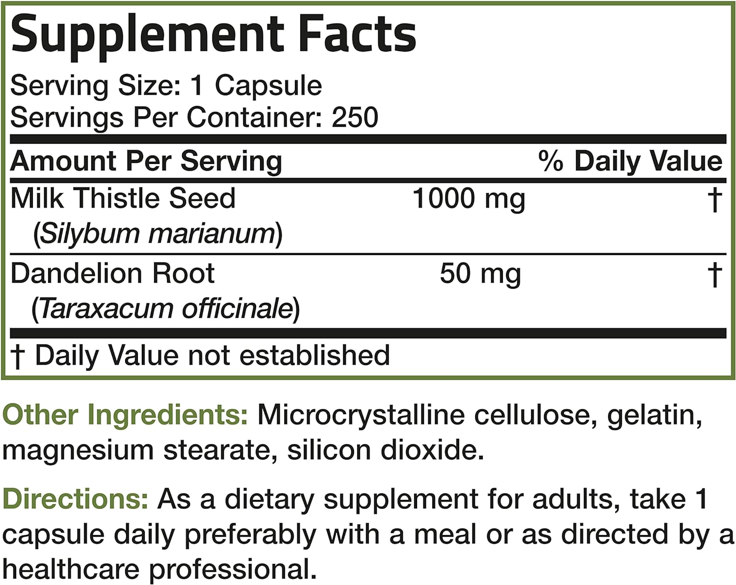 - High Potency: Each capsule contains 1,000mg of milk thistle to provide high-power liver support and contains an additional 50mg of dandelion root for additional benefits.*