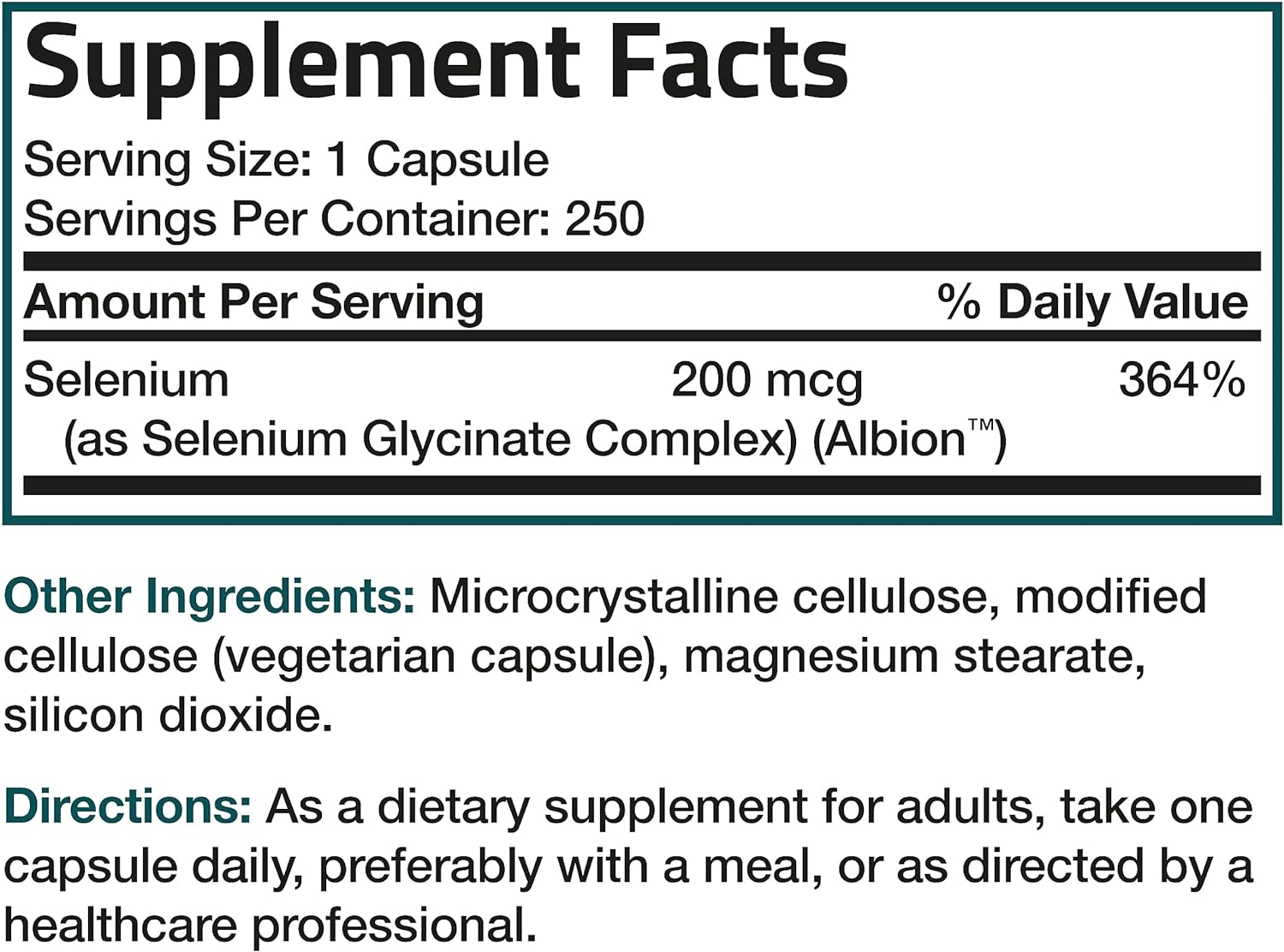 Selenium. Other ingredients: Modified cellulose (vegetarian capsule), microcrystalline cellulose, magnesium stearate, silicon dioxide.