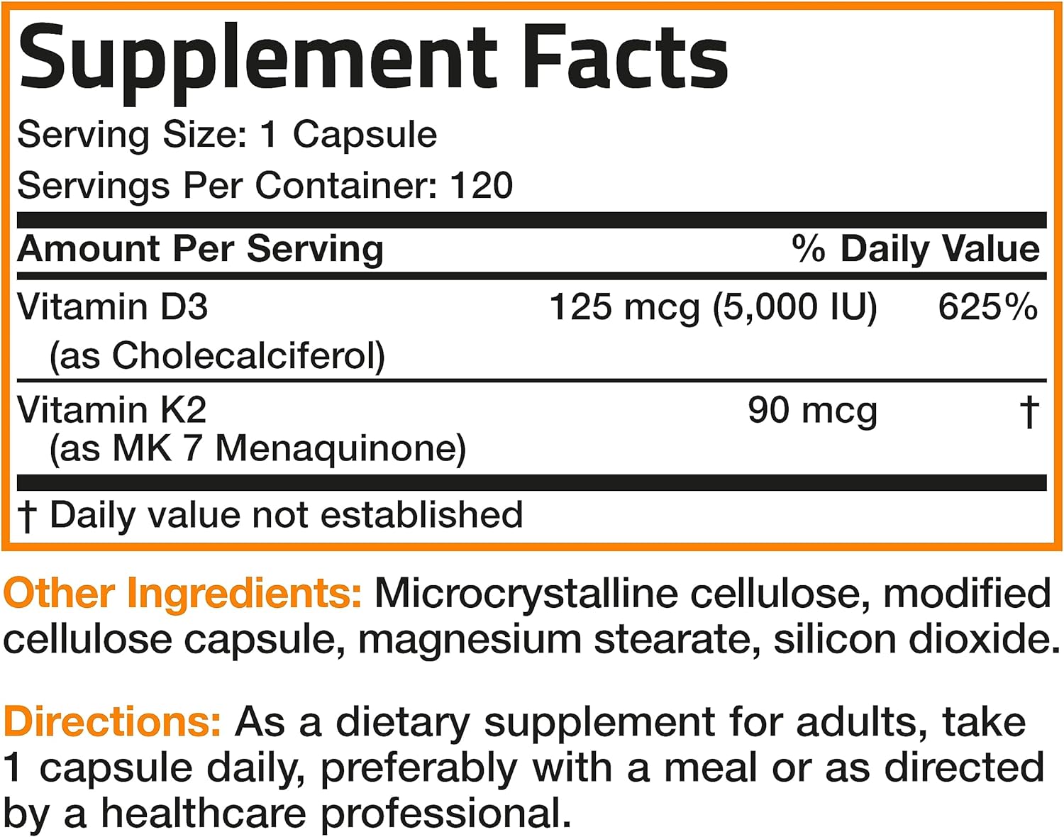Vitamin D3, Vitamin K2 Other Ingredients: Modified cellulose (capsule), microcrystalline cellulose, magnesium stearate, silicon dioxide.