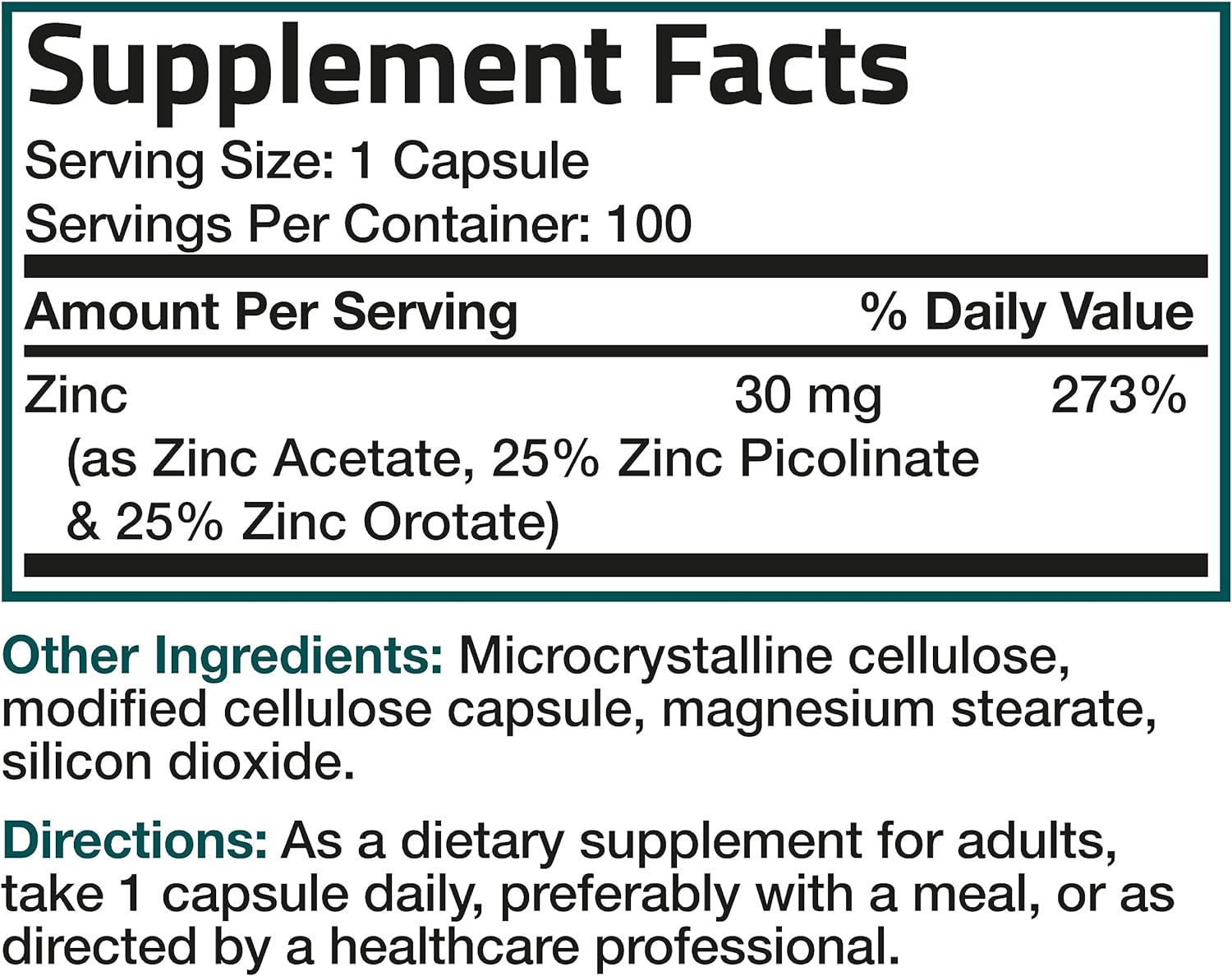 Bronson’s Zinc Triple Play 30 mg supplies 3 key forms of zinc to support a healthy immune system, antioxidant levels and overall skin health.* By providing Zinc Acetate, Picolinate and Orotate, Zinc Triple Play combines 3 forms of this essential trace mineral to work together to enable superior coverage/replenishment. Zinc Triple Play is in-house tested and free of GMOs, Gluten, and Soy within our state of the art cGMP Registered New York Facility.