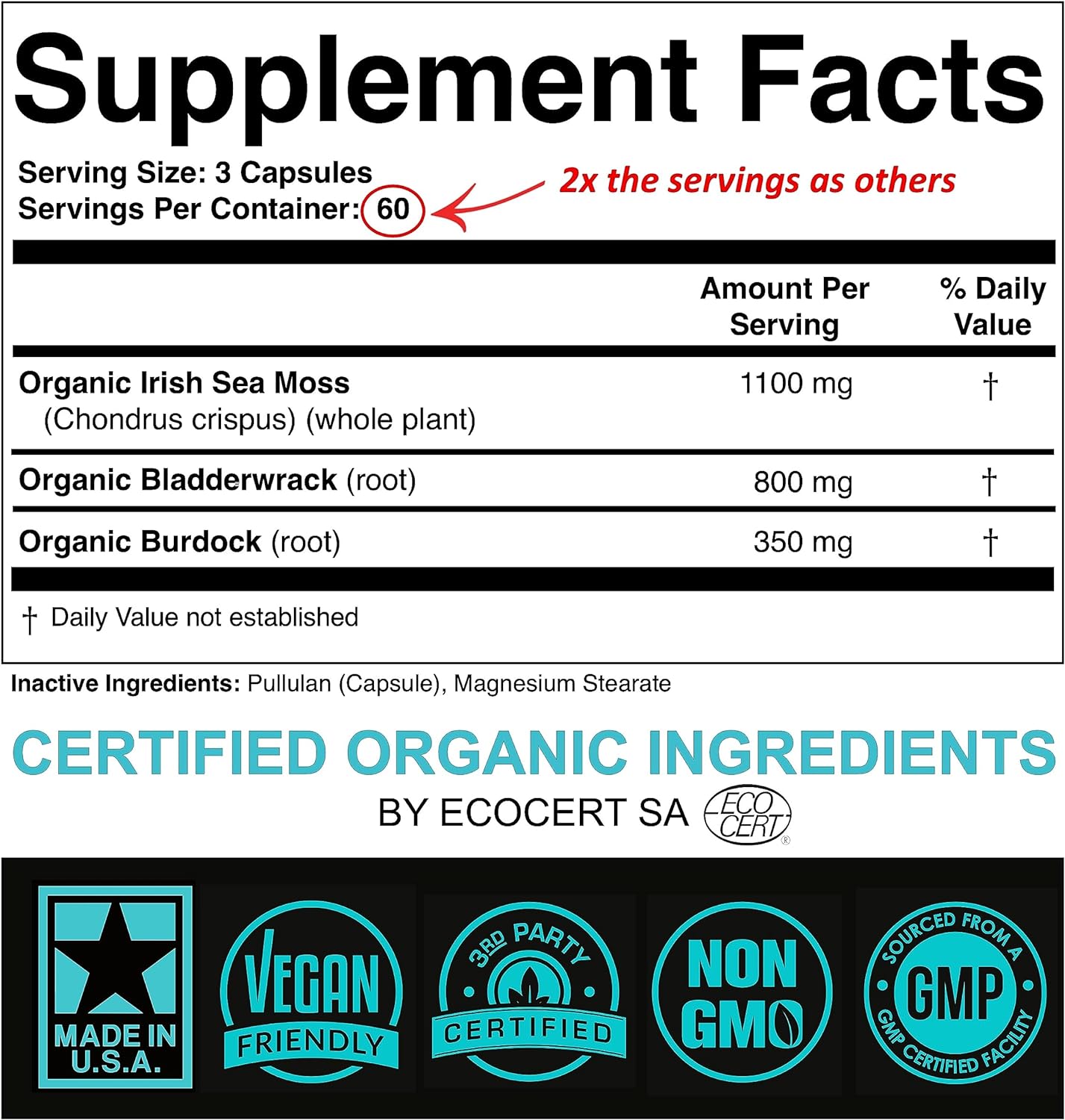 - Quality is our priority, so we go the extra mile to harvest our sea moss from the purest sources of the Atlantic Ocean. We commit to strict quality control to be able to have the Made With Certified Organic By EcoCert, seal of approval. We value transparency and provide no hidden proprietary blend ingredient counts. With 180 capsules at 2,250mg per serving of Sea Moss, we provide adequate value compared to others.