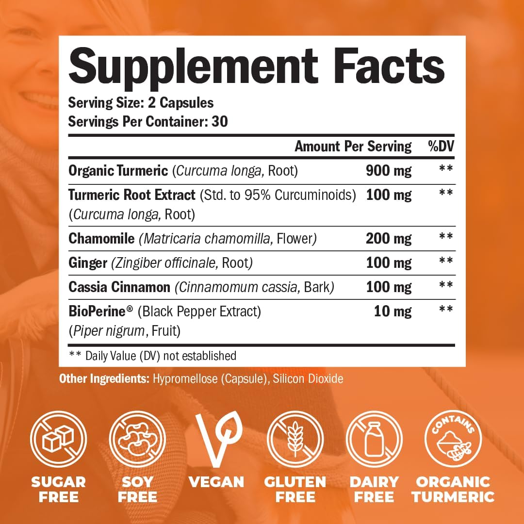 Per serving (2 capsules): Organic Turmeric Root (Curcuma longa) 900 mg, Turmeric Root Extract (Std. to 95% Curcuminoids) 100 mg, Chamomile Flower (Matricaria chamomilla) 200 mg, Ginger Root (Zingiber officinale) 100 mg, Cinnamon Bark (Cinnamomum cassia) 100 mg, BioPerine (Black Pepper Extract; Piper nigrum; Fruit) 10 mg. Other Ingredients: Hypromellose (Capsule), Microcrystalline Cellulose, Magnesium Stearate, Silica.
