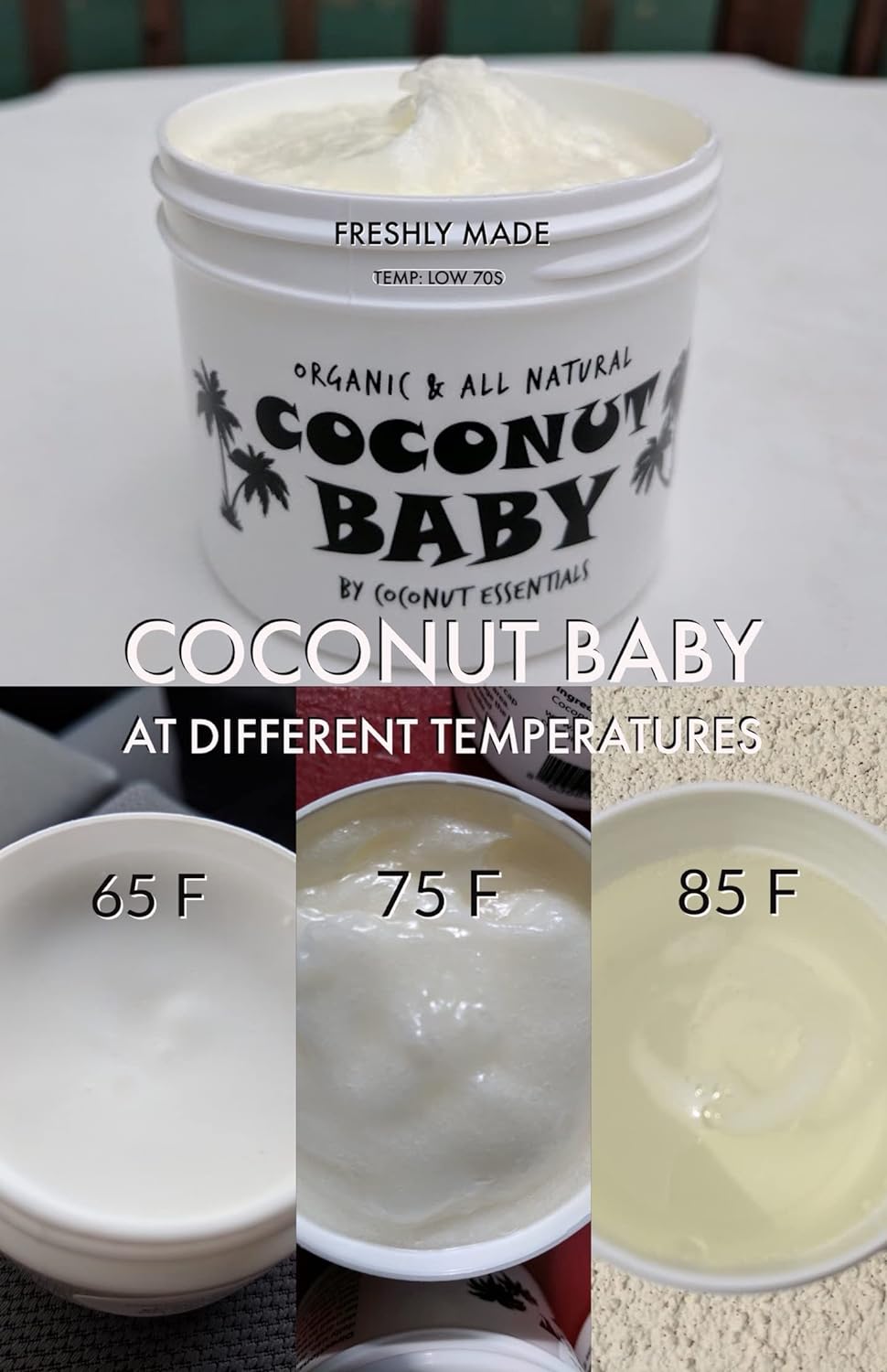Coconut Baby may be used as much as desired on hair or skin. Coconut Baby melts to a liquid if above 75 degrees F. Baby safe. Keep out of eyes.