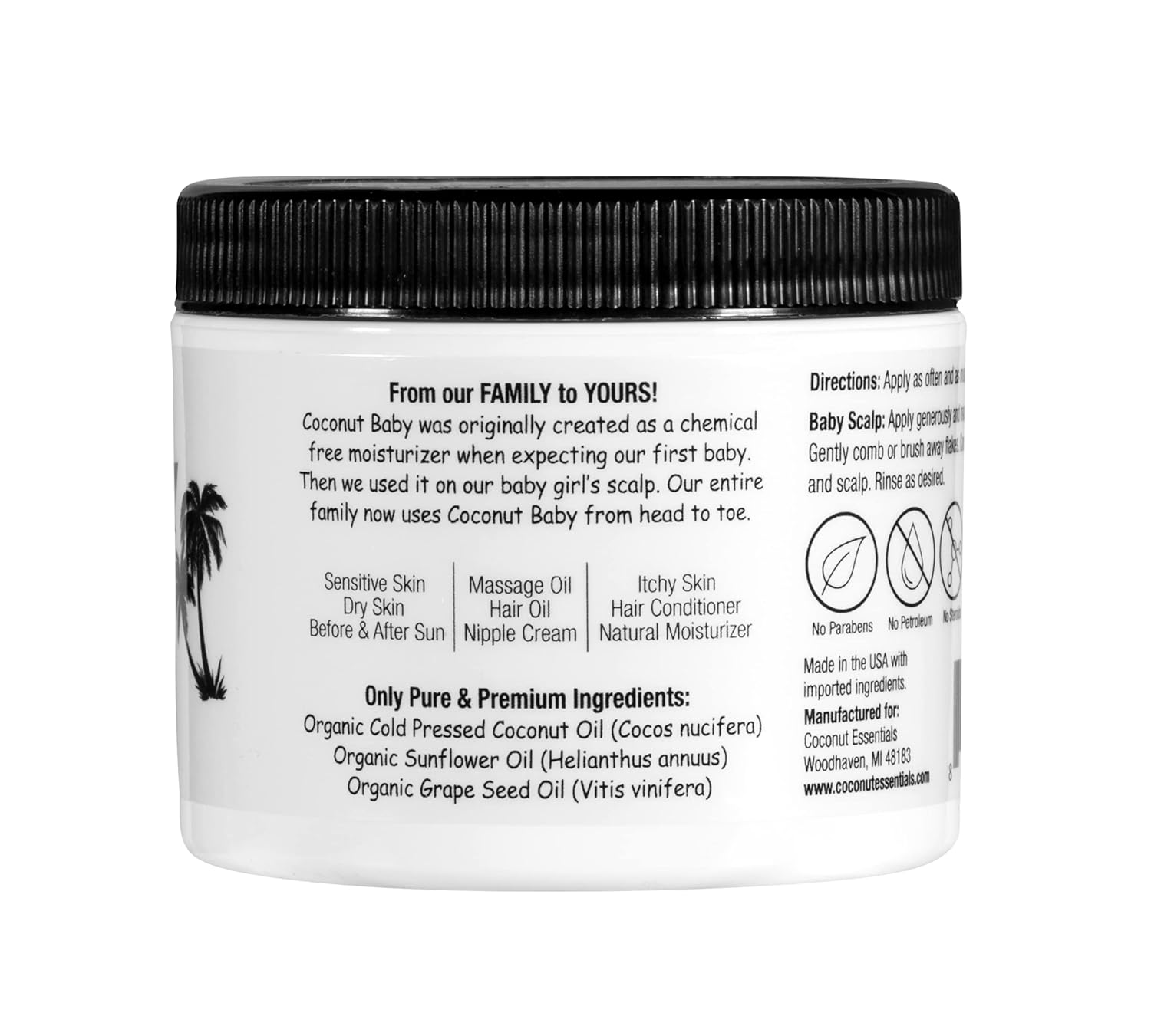 Coconut Baby oil – made for Baby sensitive skin and hair. Coconut Baby is the Perfect All-in-One moisturizer for the entire family. We commonly use for: Dry Skin & Hair, Moisturizer, Baby scalp, Red and Irritated skin, Massage oil, Hair Styling / Conditioning / Mask, lip balm, and Chemical free Make-up remover.