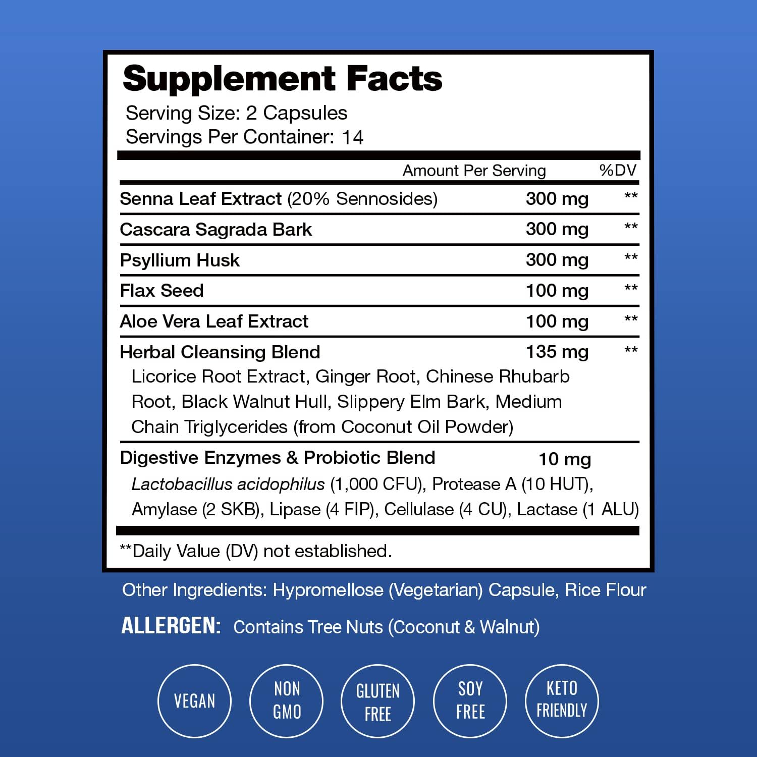- Scientifically Formulated - Featuring clinically studied herbs Senna Leaf, Cascara Sagrada, Psyllium Husk, Flaxseed, a proprietary Herbal Cleansing Blend and more, this comprehensive formula offers everything your body needs for a wholesome one-stop-cleansing-shop. Lighten up with an effective and purifying detox that supports healthy bowel movements and overall digestive health & wellness.