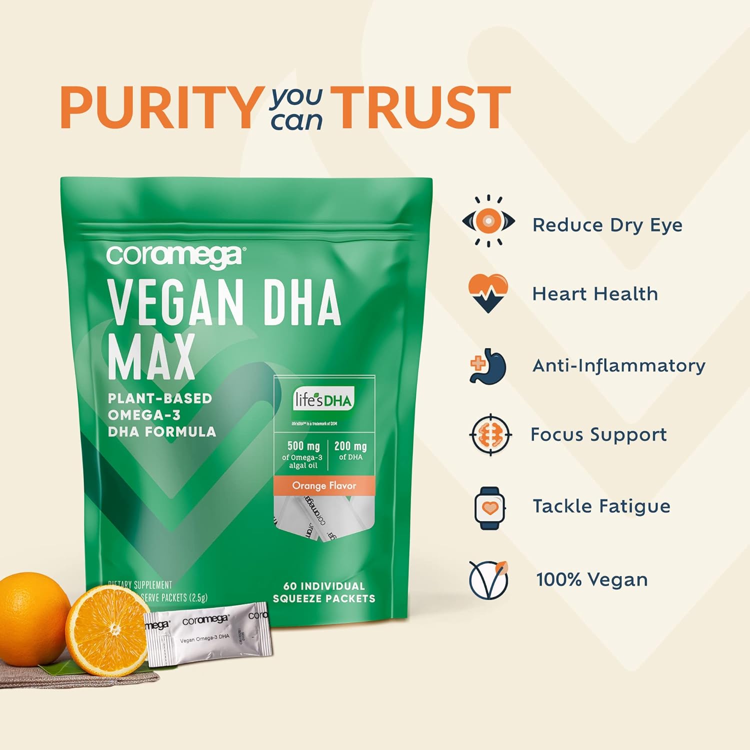 - Plant-based, great tasting algal oil: Our delicious orange flavored vegan omega-3 is made using a process that turns algal oil into a tasty emulsified treat. Our squeeze packets are loved by both vegetarians and vegans, adults and kids. You won't get fish burps, we promise!