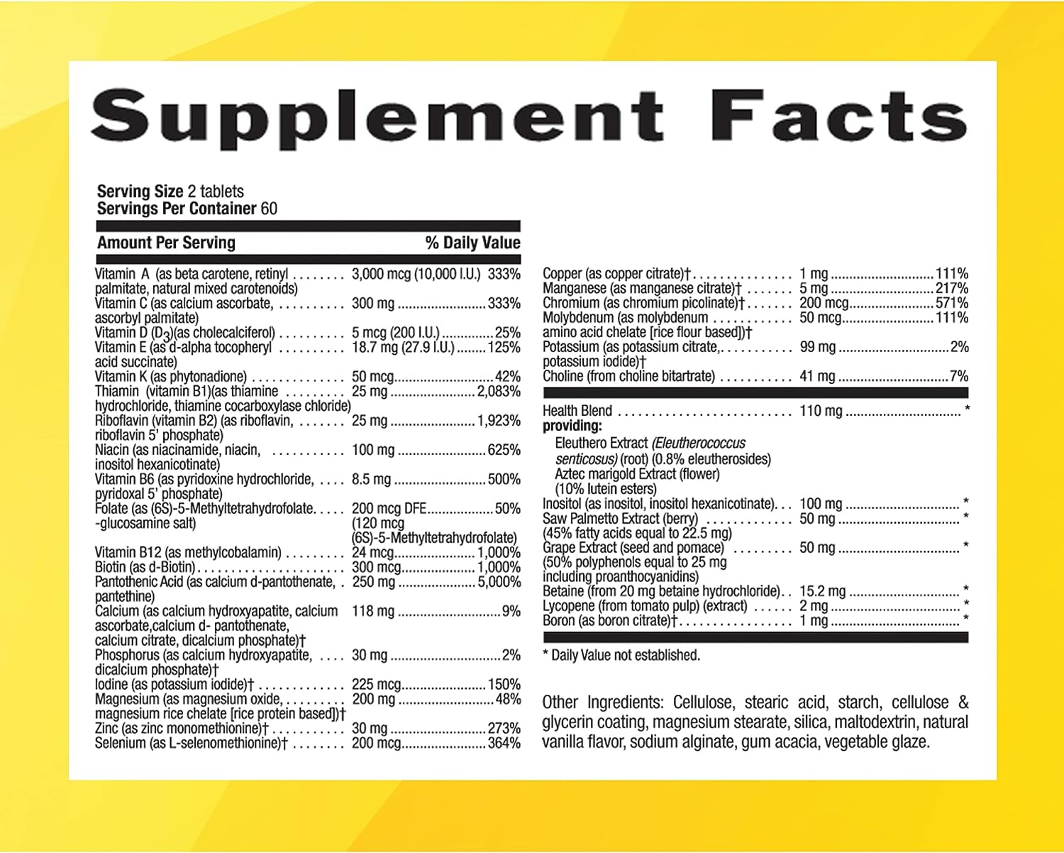 - An iron-free multivitamin and multimineral complex that includes key nutrients for men’s health