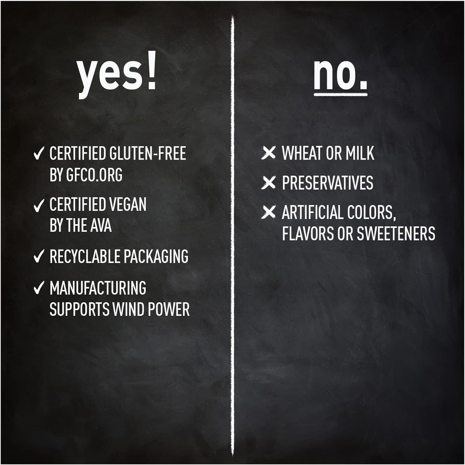 Responsibly made - Certified Gluten Free, Vegan and Kosher made with recyclable packaging the manufacturing of this product supports wind power. This product does not contain yeast, corn, wheat, soy, milk, preservatives or artificial colors, flavors or sweeteners.