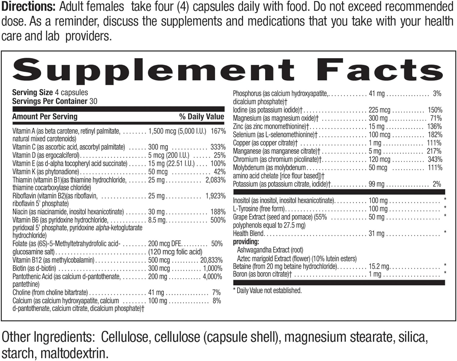 - Made for women - A multivitamin and multimineral complex that includes key nutrients for women’s health such as coenzymated B vitamins for energy metabolism plus ashwagandha, chaste tree berry and grape seed extracts.