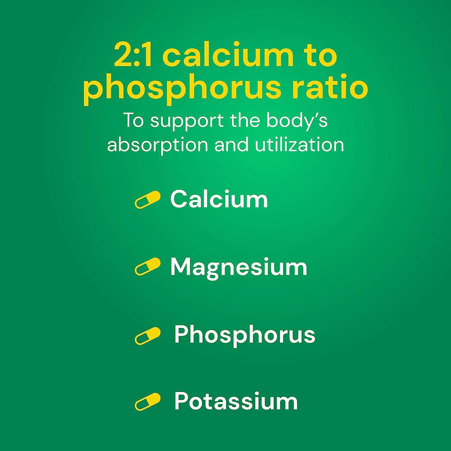- Supports calcium utilization - uses a calcium to phosphorus and calcium to magnesium ratio of 2:1 to support calcium utilization and the body’s availability of calcium. This healthful blend of calcium and magnesium contains 1000mg calcium, 500mg magnesium and 500mg phosphorus per serving