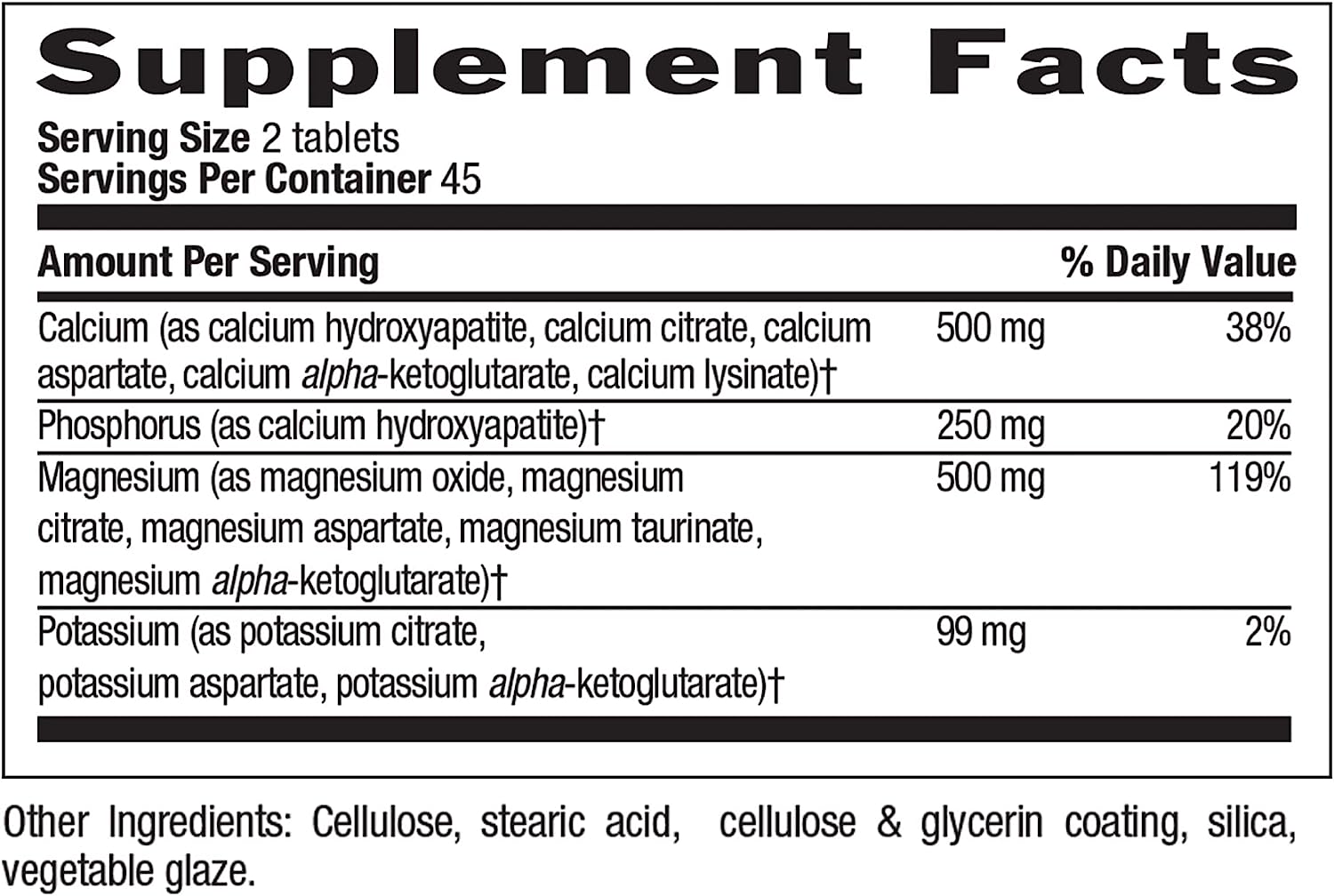 - 500mg magnesium – Contains magnesium, an essential mineral for maintaining normal bones and teeth. Also supports blood pressure levels that are already in the normal range