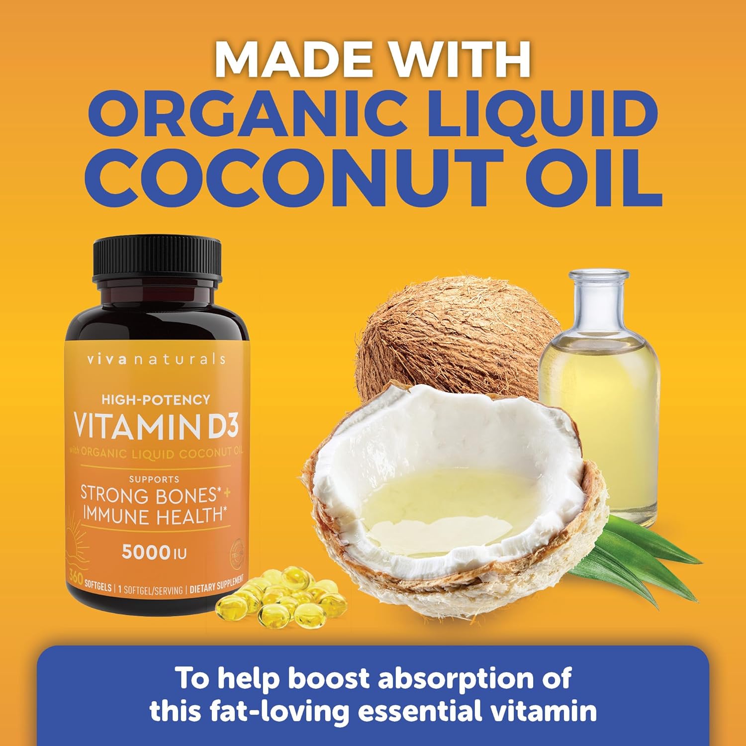 - ✅ MADE WITH ORGANIC LIQUID COCONUT OIL: We want you to get the most out of your D3 vitamin 5000 IU, so unlike other brands offering vitamin D3 in soybean or olive oil, our Vitamin D3 5000 IU soft gels is made with organic liquid coconut oil. Fat-soluble vitamins like vitamin D are best paired with fats for better absorption, making coconut oil and our vitamin d supplements the perfect pairing.