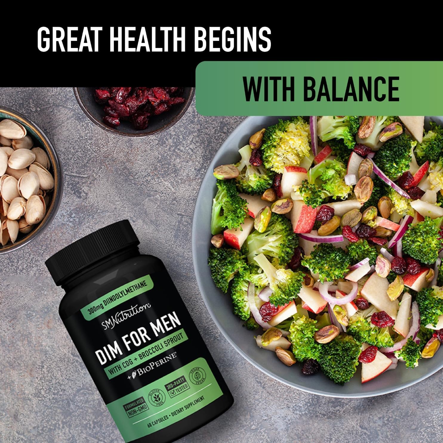 - THE SMNUTRITION DIFFERENCE: DIM 300 for Men is Third-Party Tested, Gluten-Free, Non-GMO, Vegetarian, Titanium Dioxide-Free, Silicon Dioxide Free, PETA.org Certified, and formulated without the top 9 allergens. Manufactured in a facility that is certified GMP compliant with UL standards and ISO testing standards.