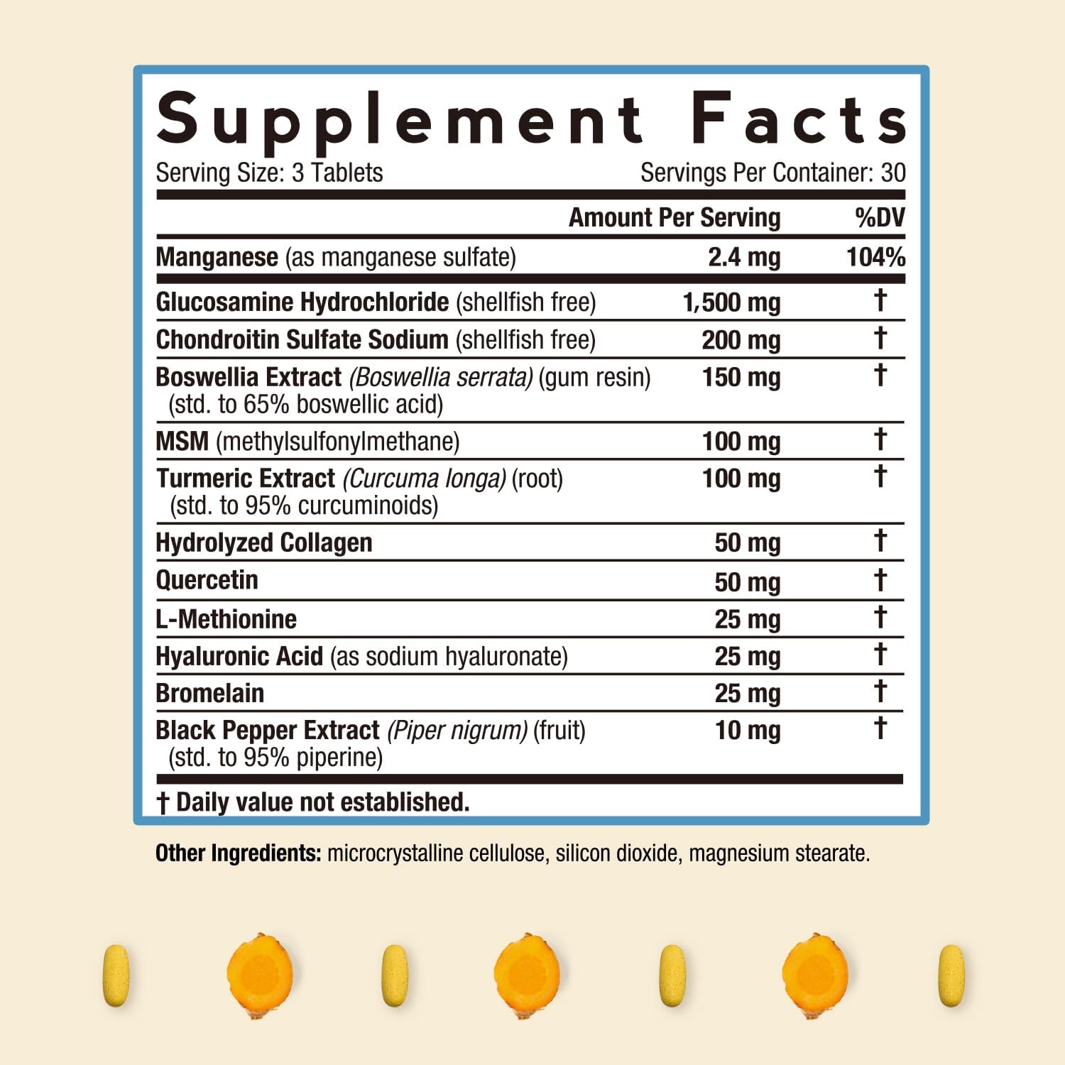 Manganese, Glucosamine Sulfate, Chondroitin Sulfate, MSM (methylsulfonylmethane), Boswellia Extract, (Boswellia serrata) (gum resin), (standardized to 65% Boswellic acid), Turmeric Extract (Curcuma longa) (root) (standardized to 95% curcuminoids), Hydrolyzed Collagen, Quercetin, L-Methionine Bromelain, Hyaluronic Acid, Black Pepper Extract.