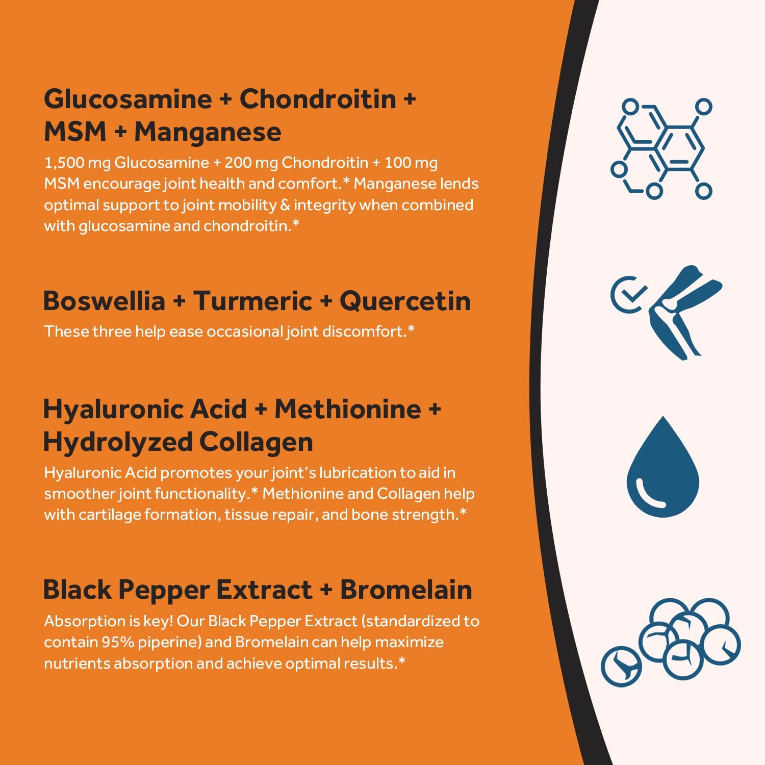 - Unparalleled & Exclusive Blend for Ultra Joint Care:* Our carefully crafted formula delivers ultimate combination of natural ingredients, including Glucosamine Sulfate, Chondroitin Sulfate, Turmeric, MSM, Boswellia, Quercetin, Methionine, Bromelain, Hyaluronic Acid & Manganese, to offer unmatched results for complete joint care.*