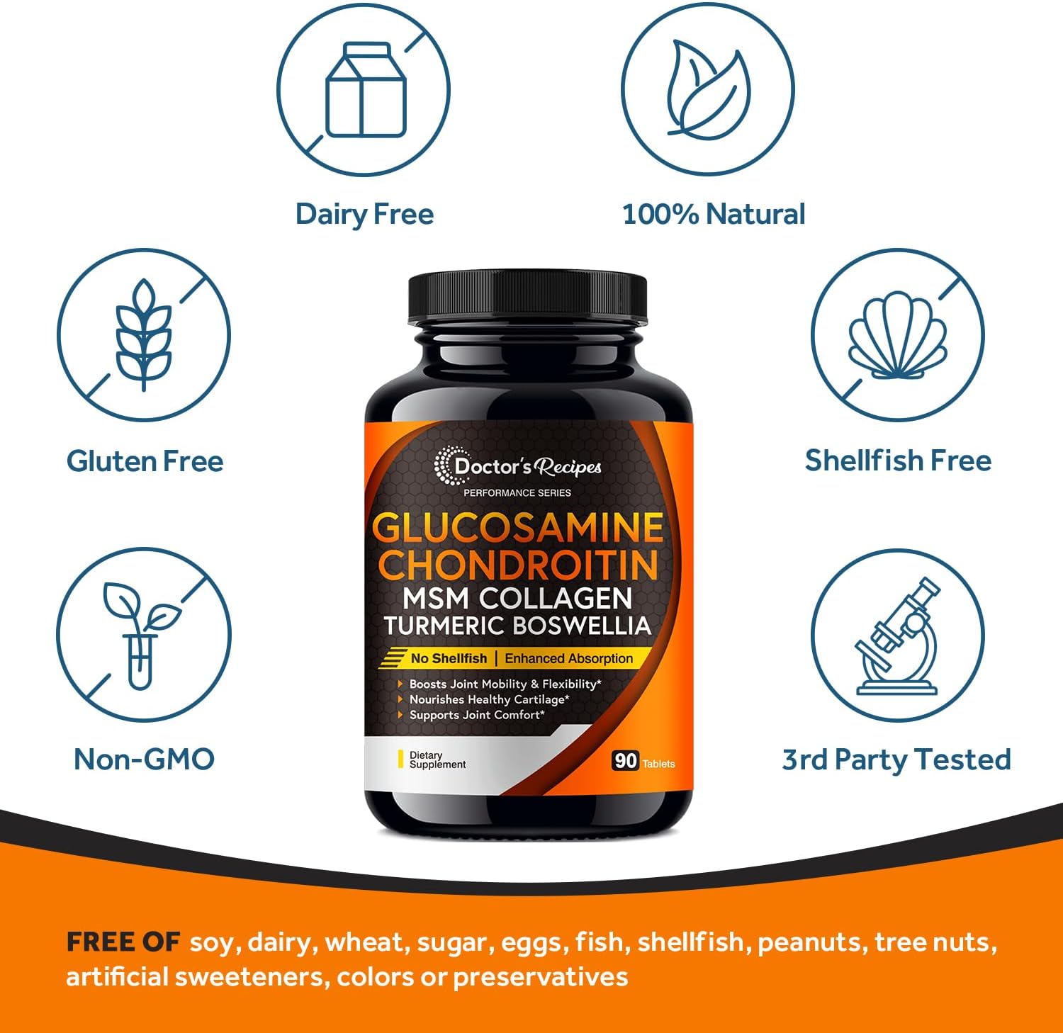 - Shellfish Free & High Absorption: Doctor's Recipes Glucosamine Chondroitin MSM does not contain any shellfish which causes allergy and concerns many of our customers. We’ve also included bromelain and black pepper extract for faster absorption, especially for quercetin and turmeric curcumin, and to reach optimum results.
