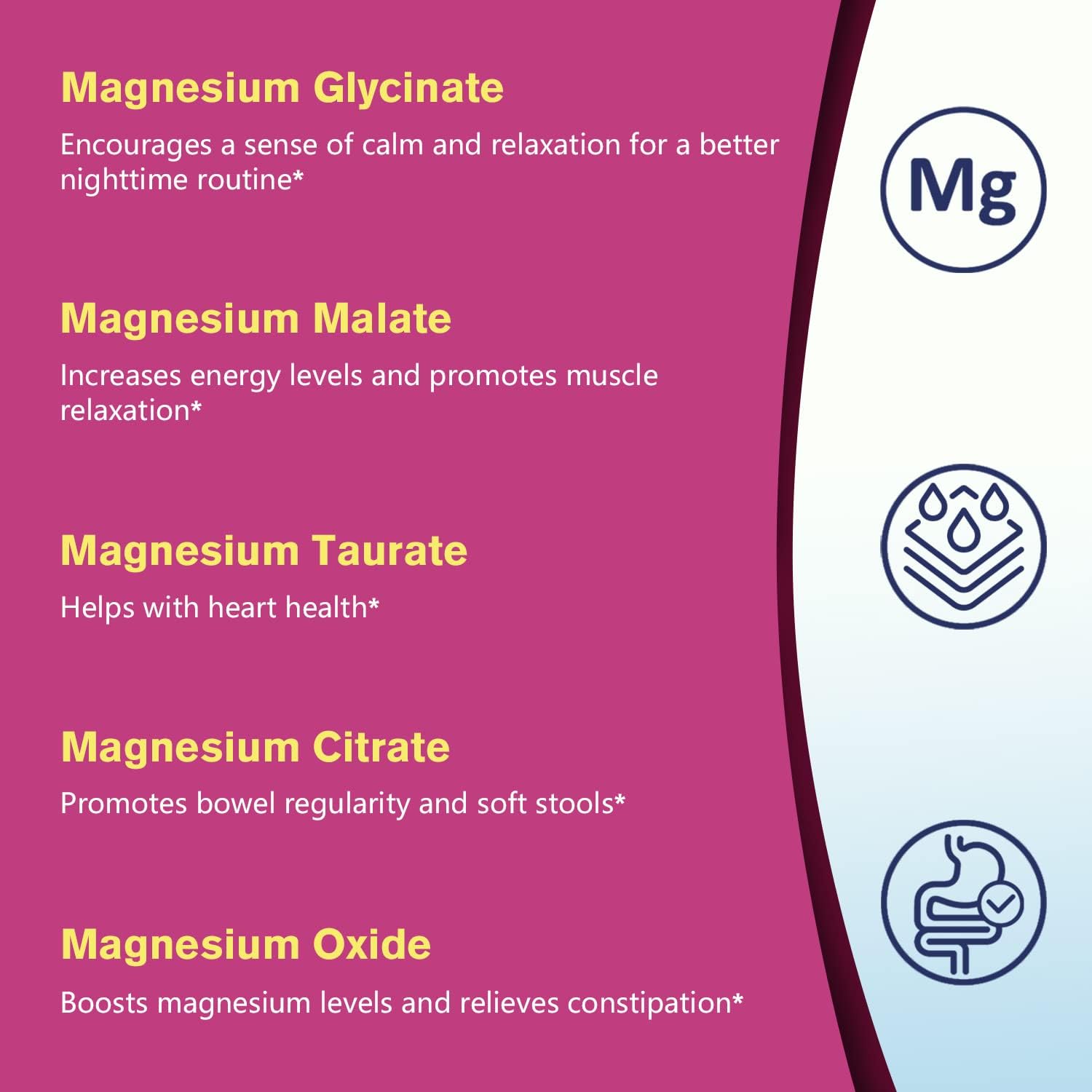 - Supports Muscle, Heart, Nerve Health & Digestion*: Each magnesium type offers unique benefits. Our formula promotes muscle relaxation, heart health, and normal nerve function. It may also support healthy digestion*. Experience the combined benefits for a balanced well-being*.