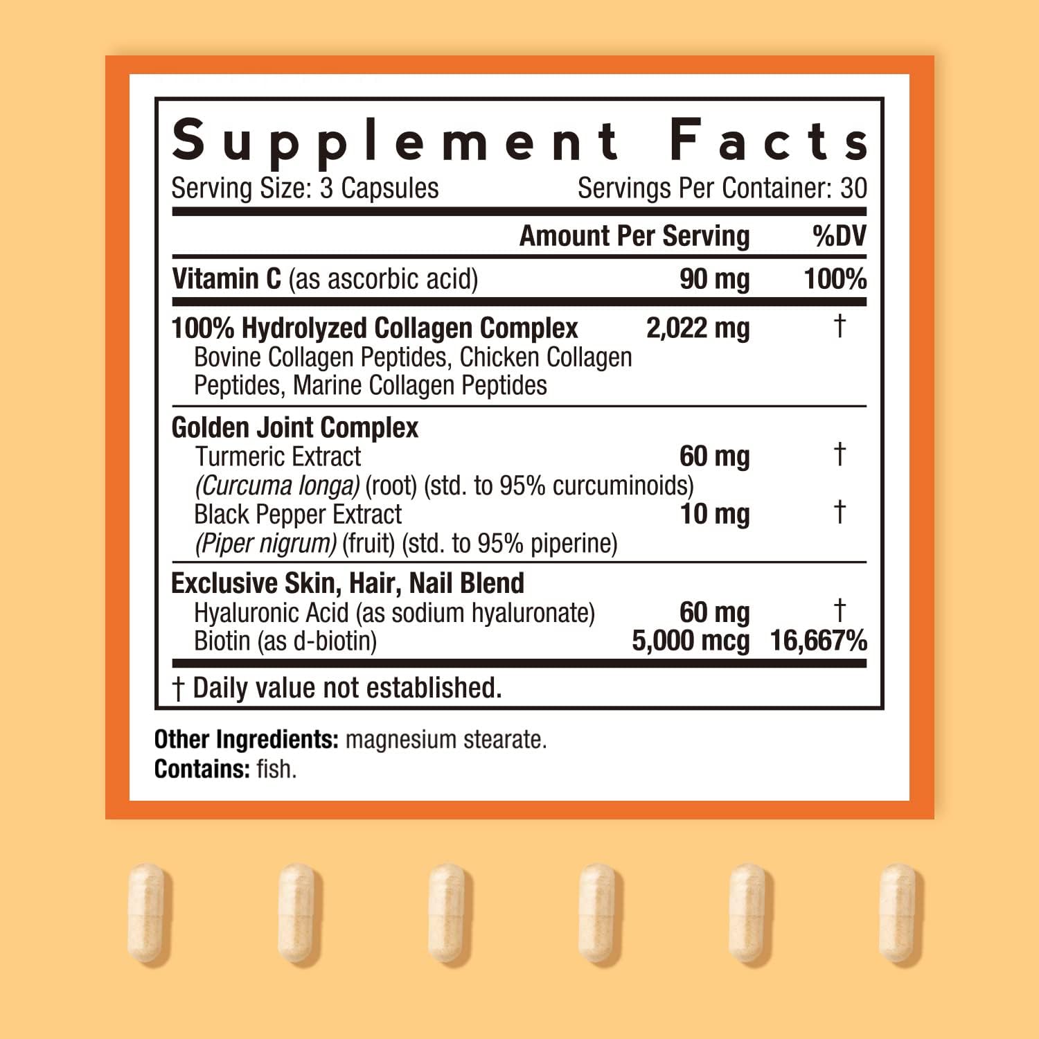100% Hydrolyzed Multi Collagen Complex Exclusive Skin, Hair, Nail Blend: Hyaluronic Acid (as sodium hyaluronate), Vitamin C (as ascorbic acid), Biotin (as d-biotin). Golden Joint Complex: Turmeric Extract, Black Pepper Extract.