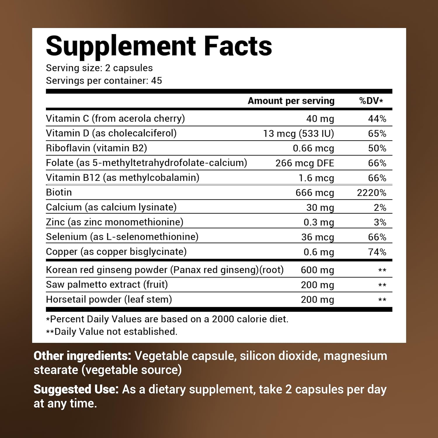 - ๐๐๐๐ฅ ๐๐ข๐ฅ๐ ๐จ๐๐ - Made for men and women, this hair supplement is packed full of natural vitamins like Zinc, Copper, Vitamins C, D3, B2, B12, Calcium, Selenium and more. Enhanced with special ingredients like Biotin, Saw Palmetto, Horsetail Herb Powder and Korean Red Ginseng. 45 day supply