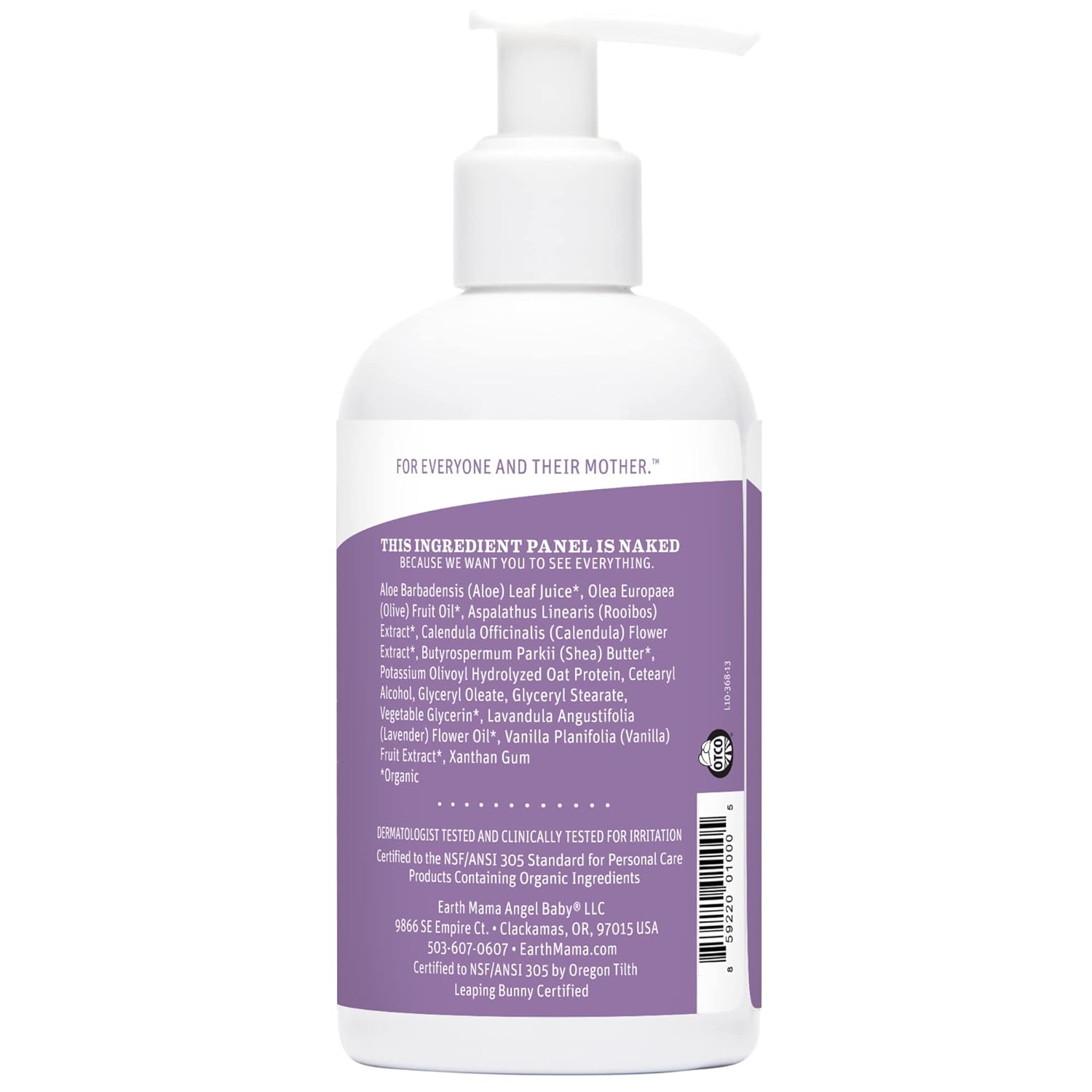 - NO WORRISOME CHEMICALS: Everything you want and nothing you don't! No petroleum, harsh synthetic preservatives or artificial fragrance. Earth Mama's vegan lotion contains organic calendula and has a ridiculously relaxing lavender vanilla scent. It's free from harmful chemicals that can be irritating to your baby's delicate skin.