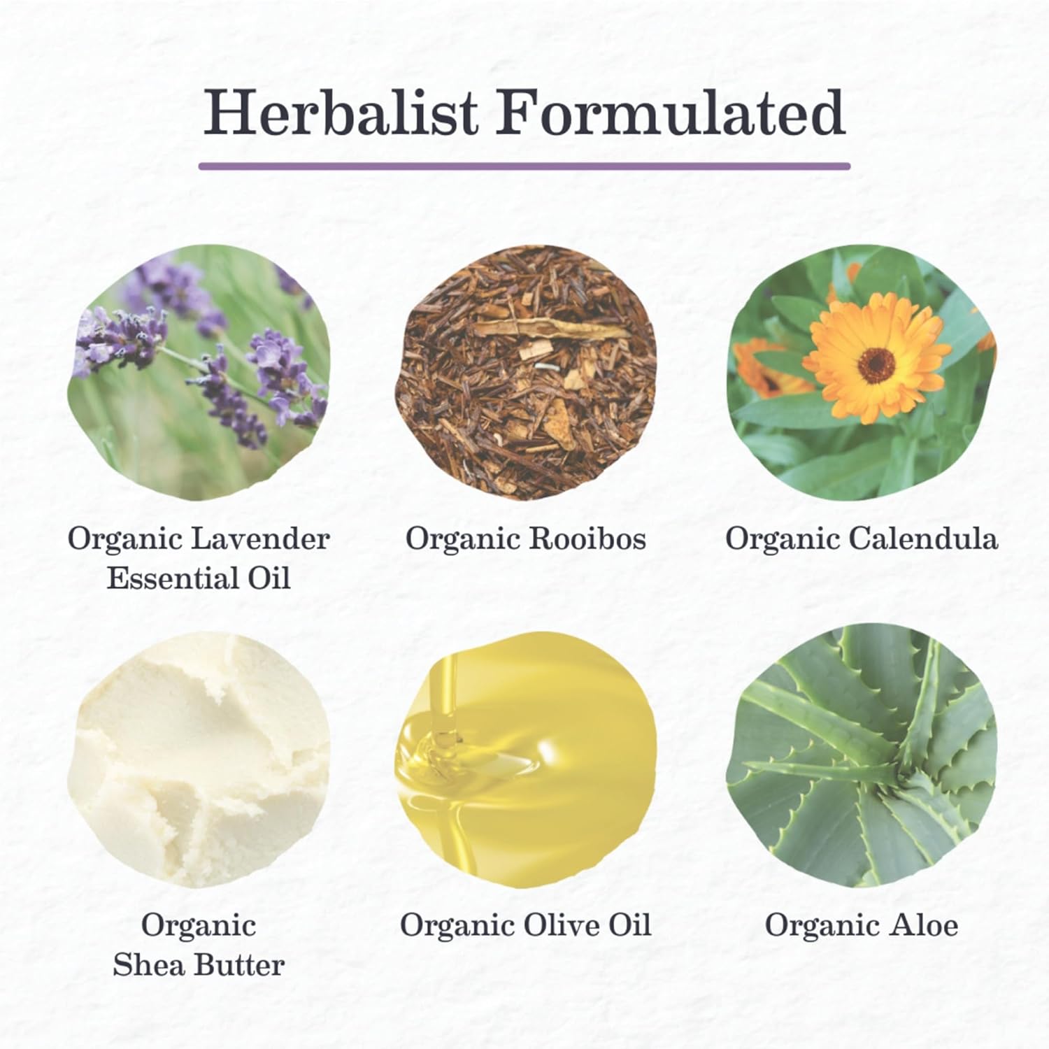 Ingredients: Organic Aloe (Aloe Barbadensis) Leaf Juice, Organic Olive (Olea Europaea) Fruit Oil, Organic Rooibos (Aspalathus Linearis) Extract, Organic Calendula (Calendula Officinalis) Flower Extract, Organic Shea (Butyrospermum Parkii) Butter, Olivoyl Hydrolyzed Oat Protein, Cetearyl Alcohol, Glyceryl Oleate, Glyceryl Stearate, Kosher Vegetable Glycerin, Organic Lavender (Lavandula Angustifolia) Flower Oil, Organic Vanilla (Vanilla Planifolia) Fruit Extract, Xanthan Gum