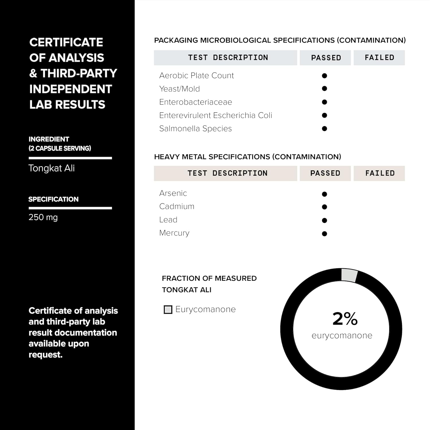 Tribulus terrestris (whole herb and fruit) 25:1 extract (Std. to 95% total saponins), Tongkat Ali - Eurycoma longifolia (root) 200:1 extract, Fadogia agrestis (root and stem) 30:1 extract, Ashwagandha - Withania somnifera (leaf and root) 40:1 extract Std. to 25% withanolides, Zinc (as Zinc Citrate Dihydrate USP), Boron (as Boron Citrate), Copper (as Copper Citrate Hemitrihydrate)
