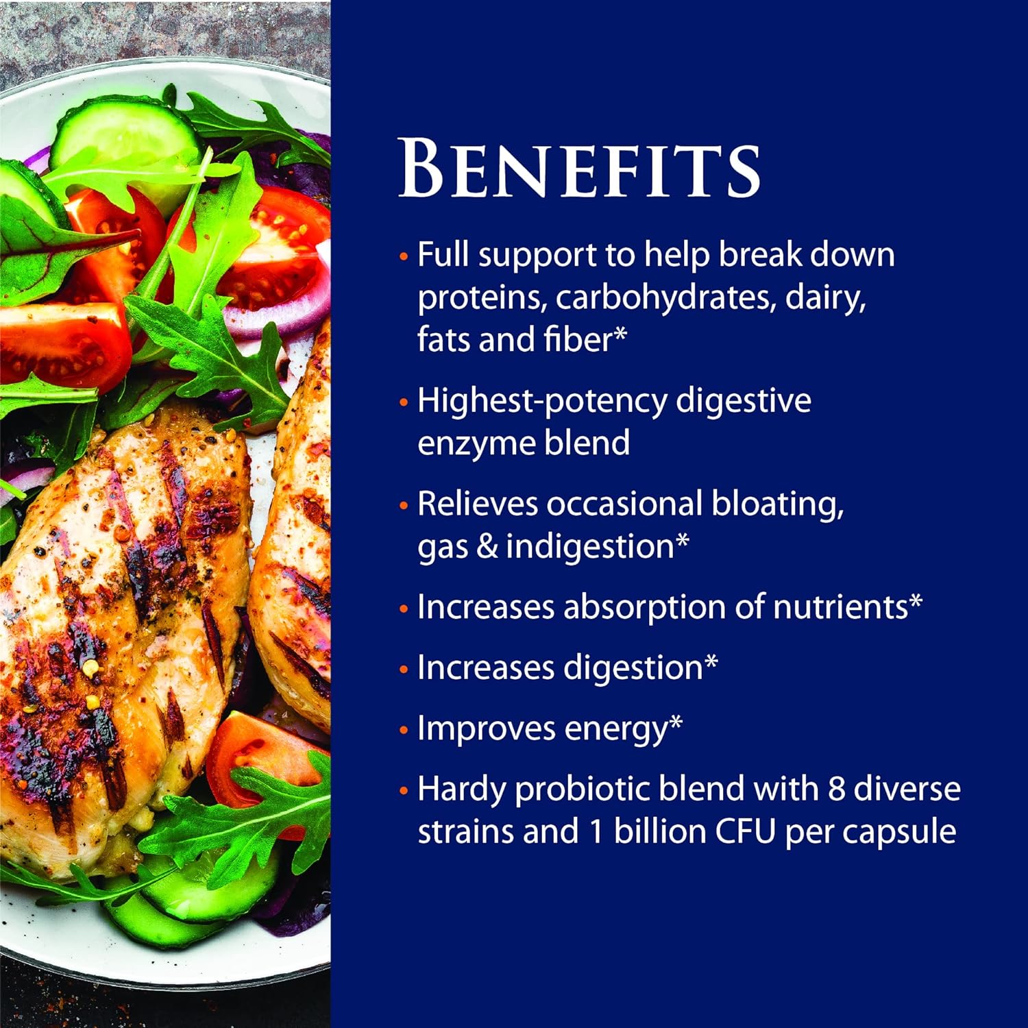 - KEY FEATURES. Key features include a highest-potency digestive enzyme blend and a probiotic blend at 1 billion CFU per capsule, all formulated for fat, fiber, protein, and carbohydrate digestion.*
