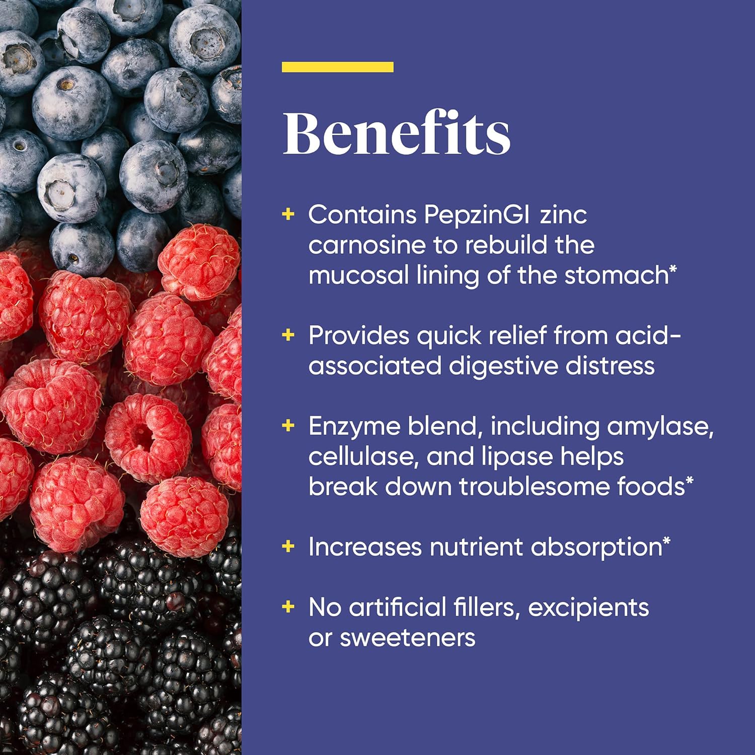 - Fast heartburn relief: A specialized enzyme blend to support digestion of foods that may cause heartburn; Zinc carnosine helps strengthen the mucosal lining of the stomach, giving you lasting relief