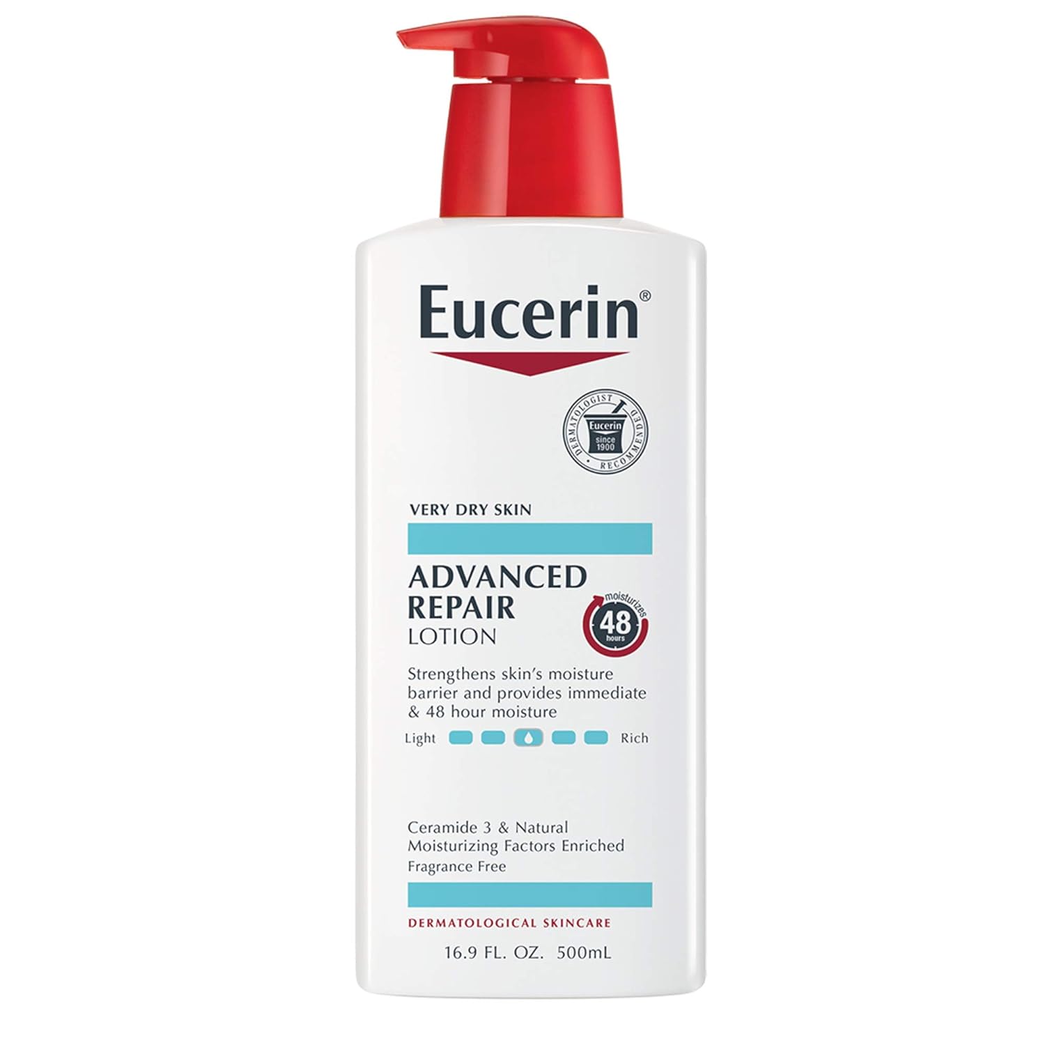Eucerin Advanced Repair Lotion is a breakthrough in repairing very dry skin and fighting dryness at its source. It provides 48 hour moisture, for skin that looks and feels healthy. This body lotion for dry skin is enriched with Ceramides-3 and Natural Moisturizing Factors. Ceramides help to strengthen the skin’s moisture barrier to lock in moisture. Natural Moisturizing Factors, amino acids that are naturally found in the skin, boost moisture and prevent dryness from reoccurring. Eucerin Advanced Repair Body Lotion is a lightweight and fast-absorbing formula that smoothes, repairs & hydrates dry skin. This body lotion is fragrance free, dye free, paraben free and is gentle enough for everyday use. To Use: Smooth over body daily. For best results, apply after showering. Pair with Eucerin Advanced Repair Cleanser for a full skin care regimen to give your skin the dermatological attention it needs.
