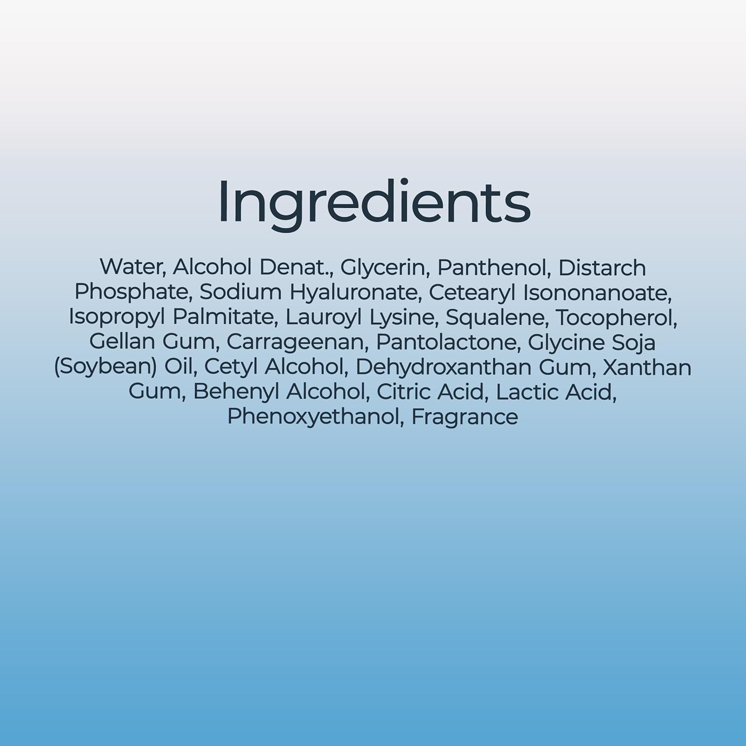 Water, Alcohol Denat., Glycerin, Panthenol, Distarch Phosphate, Sodium Hyaluronate, Cetearyl Isononanoate, Isopropyl Palmitate, Lauroyl Lysine, Squalene, Tocopherol, Gellan Gum, Carrageenan, Pantolactone, Glycine Soja (Soybean) Oil, Cetyl Alcohol, Dehydroxanthan Gum, Xanthan Gum, Behenyl Alcohol, Citric Acid, Lactic Acid, Phenoxyethanol, Fragrance