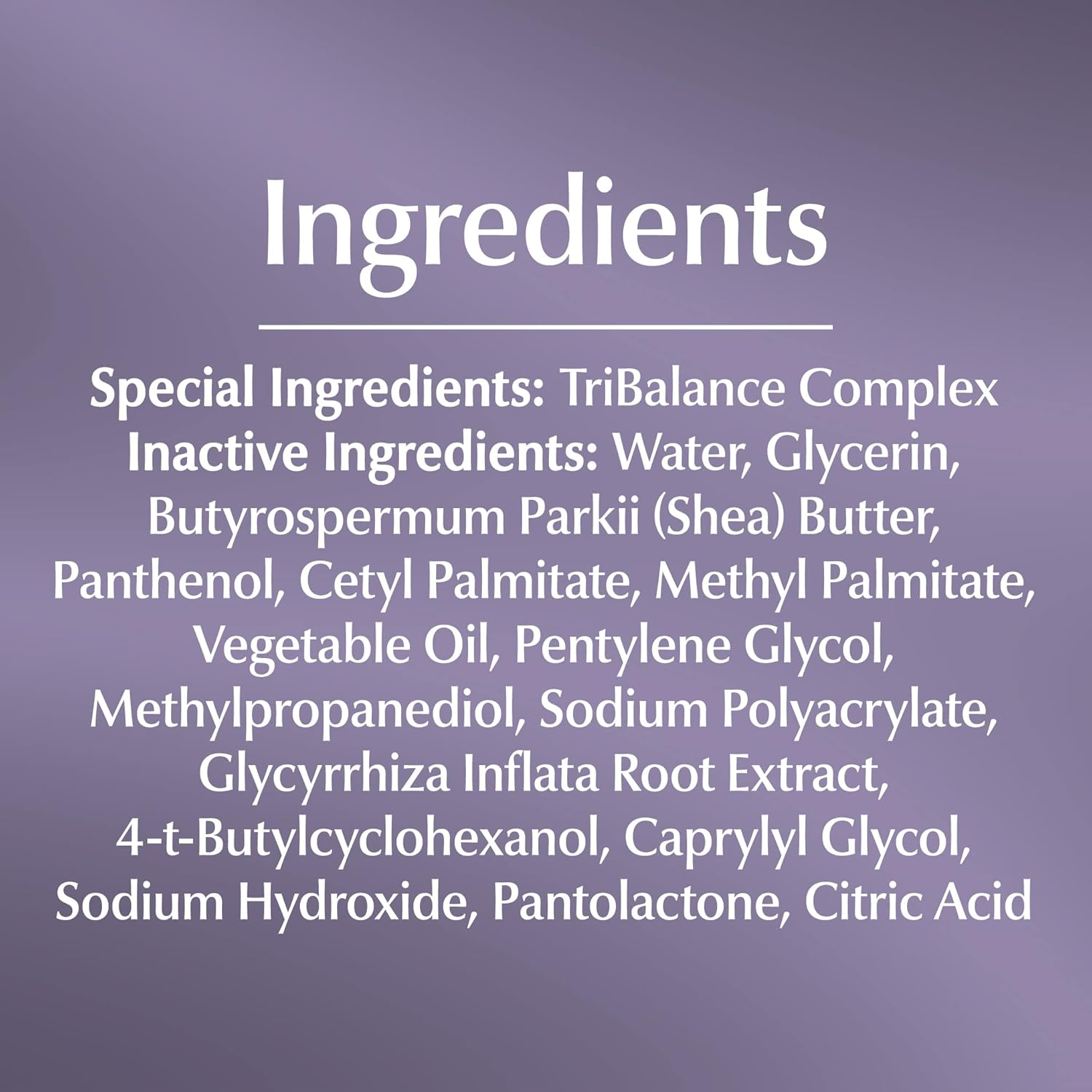 Inactive Ingredients: Water, Glycerin, Butyrospermum Parkii (Shea) Butter, Panthenol, Cetyl Palmitate, Methyl Palmitate, Vegetable Oil, Pentylene Glycol, Methylpropanediol, Sodium Polyacrylate, Glycyrrhiza Inflata Root Extract, 4-t-Butylcyclohexanol, Caprylyl Glycol, Sodium Hydroxide, Pantolactone, Citric Acid. Special Ingredients: TriBalance Complex