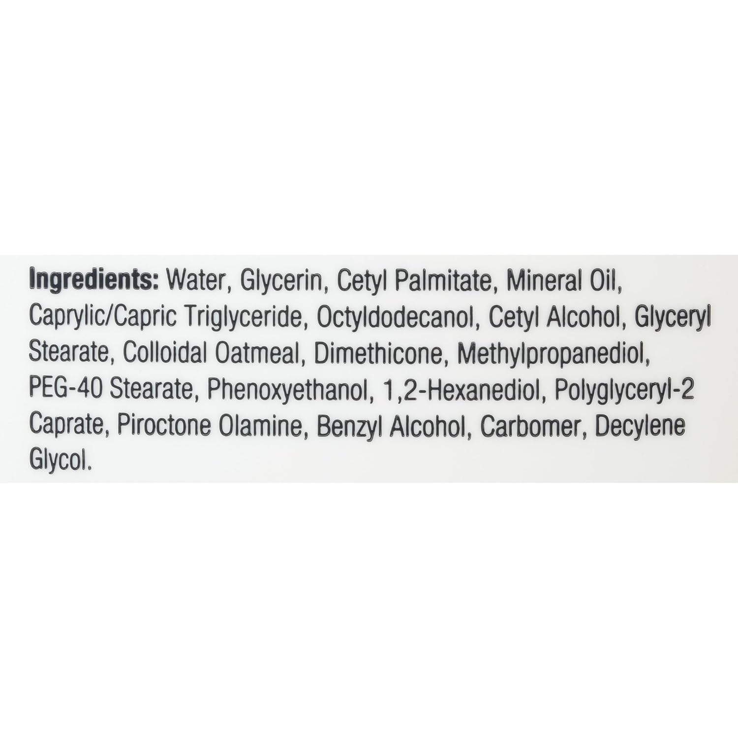 Water, Glycerin, Cetyl Palmitate, Mineral Oil, Caprylic-Capric-Triglyceride, Octyldodecanol, Cetyl Alcohol, Glyceryl Stearate, Colloidal Oatmeal (Skin Protectant), Dimethicone, Methylpropanediol, PEG-40 Stearate, Phenoxyethanol, 1-2-Hexanediol, Polyglyceryl-2 Caprate, Piroctone Olamine, Benzyl Alcohol, Carbomer, Decylene Glycol