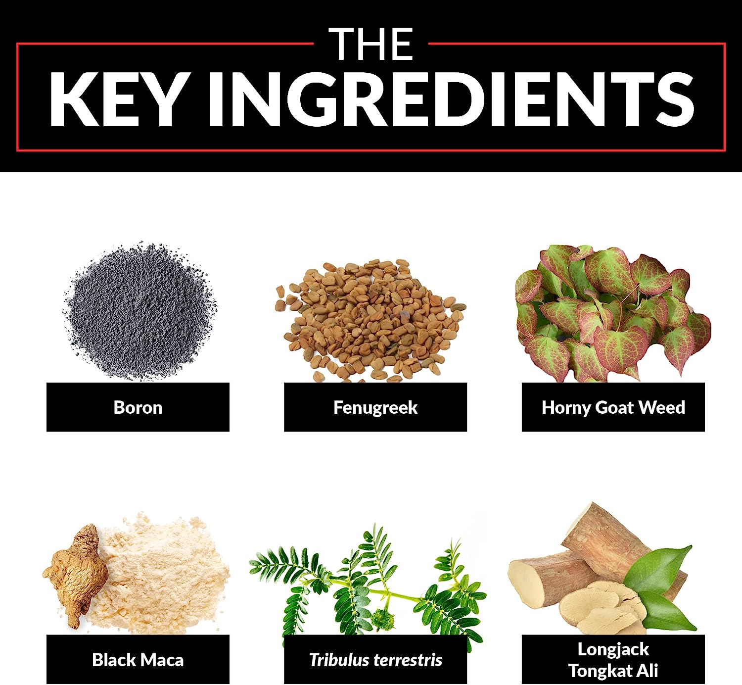 Boron Amino Acid Chelate, Fenugreek (Trigonella foenum-graecum) Extract (seed), Black Maca (Lepidium meyenii) Extract (root), Tongkat Ali Longjack (Eurycoma longifolia) Extract (root), Tribulus terrestris Extract (fruit), Horny Goat Weed (Epimedium sagittatum) Extract (aerial parts)