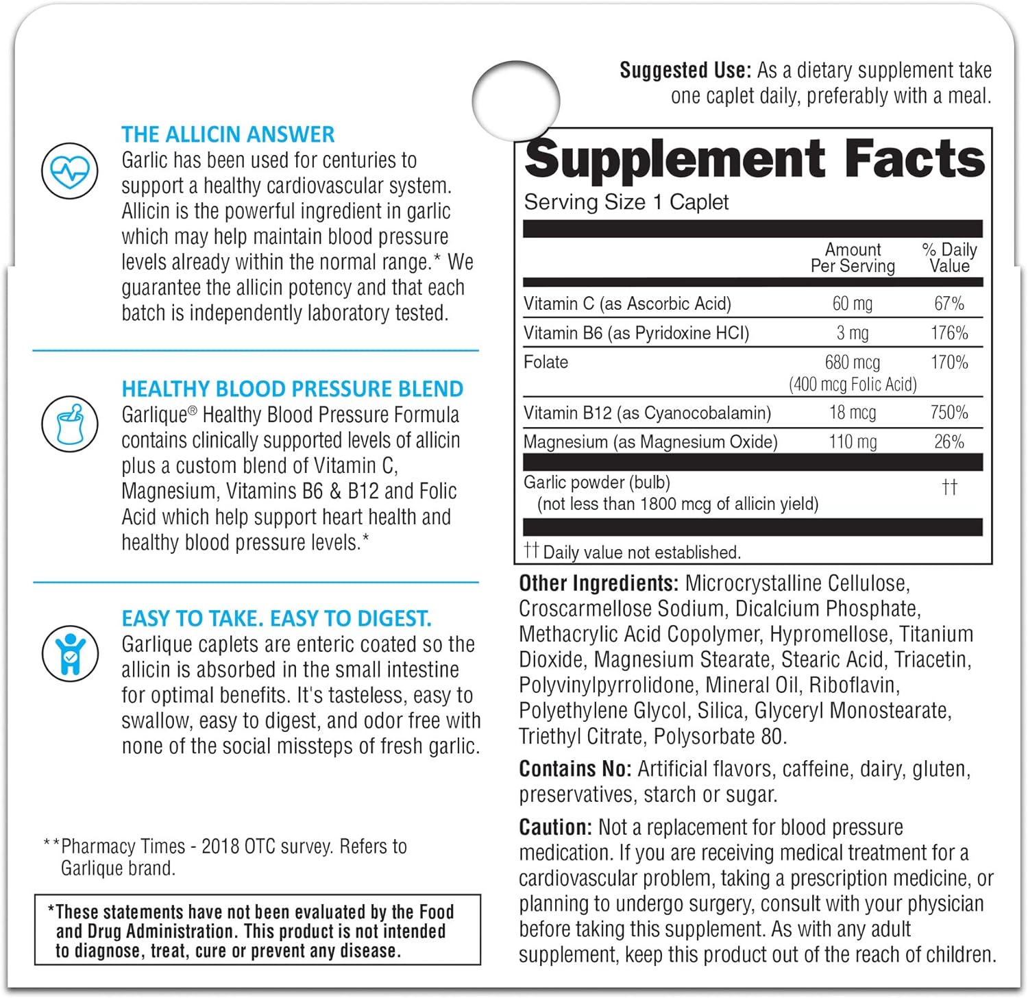 - HIGH QUALITY SUPPLEMENT: Garlique Healthy blood pressure formula is also gluten free, Non-GMO, Vegan Friendly, and soy free.