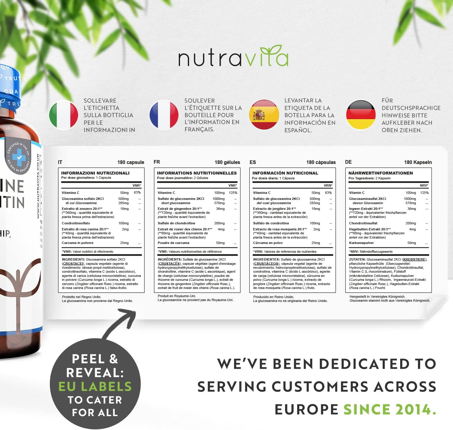 - ✔ WHY NUTRAVITA'S GLUCOSAMINE & CHONDROITIN COMPLEX SUPPLEMENT? - Our supplement contains 1000mg of Glucosamine Sulphate & 200mg of Chondroitin Sulphate per serving. Furthermore, our supplement has been blended with Vitamin C, Turmeric, Ginger Root & Rosehip for added benefits.
