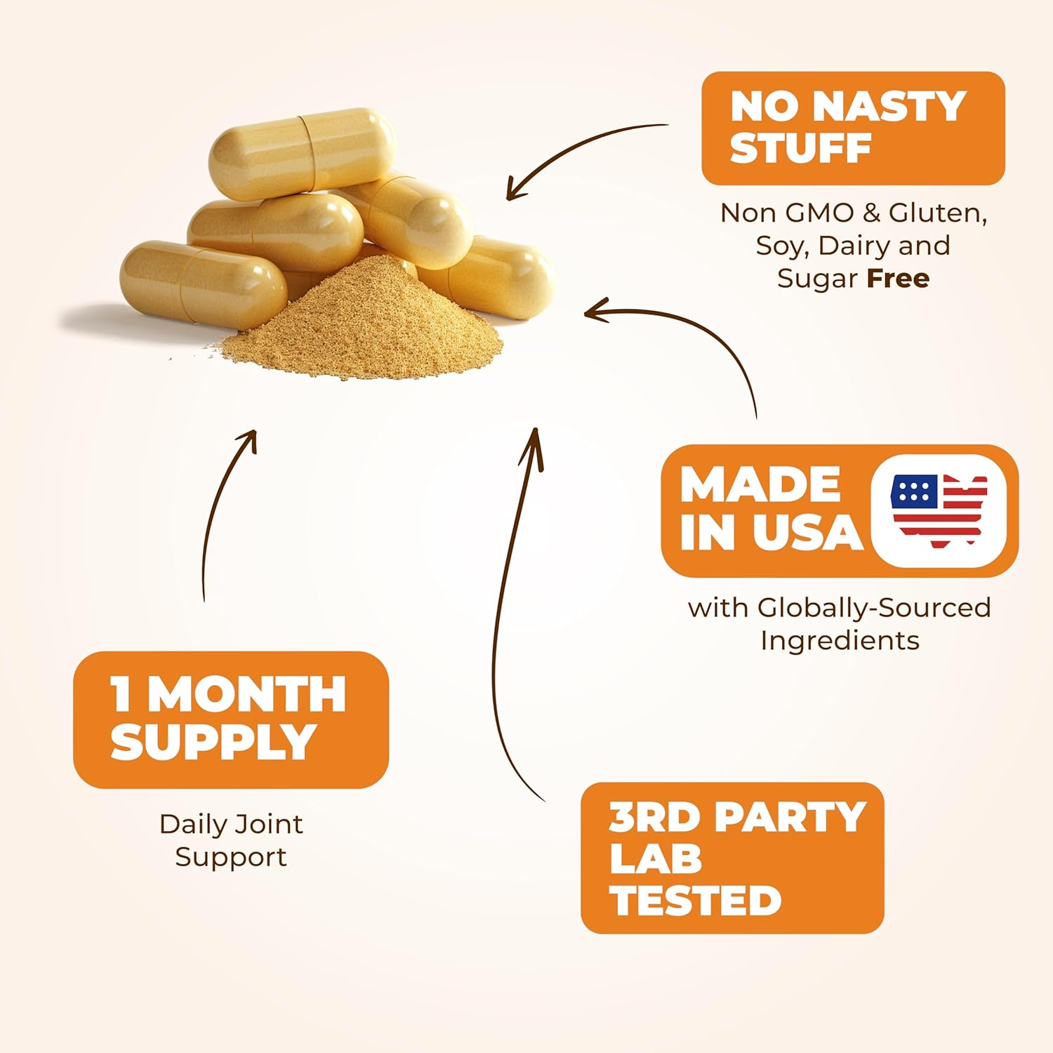 PREMIUM JOINT SUPPLEMENTS FOR MEN AND WOMEN. Chondroitin & Glucosamine Nutritional Supplements made in the USA in a cGMP-Certified & NSF-Certified Facility with Globally-Sourced ingredients. Non-GMO. HSA & FSA Vitamins Approved. Free from Gluten, Dairy, Sugar, Soy. No Shellfish, No Pork, No Shark Cartilage.