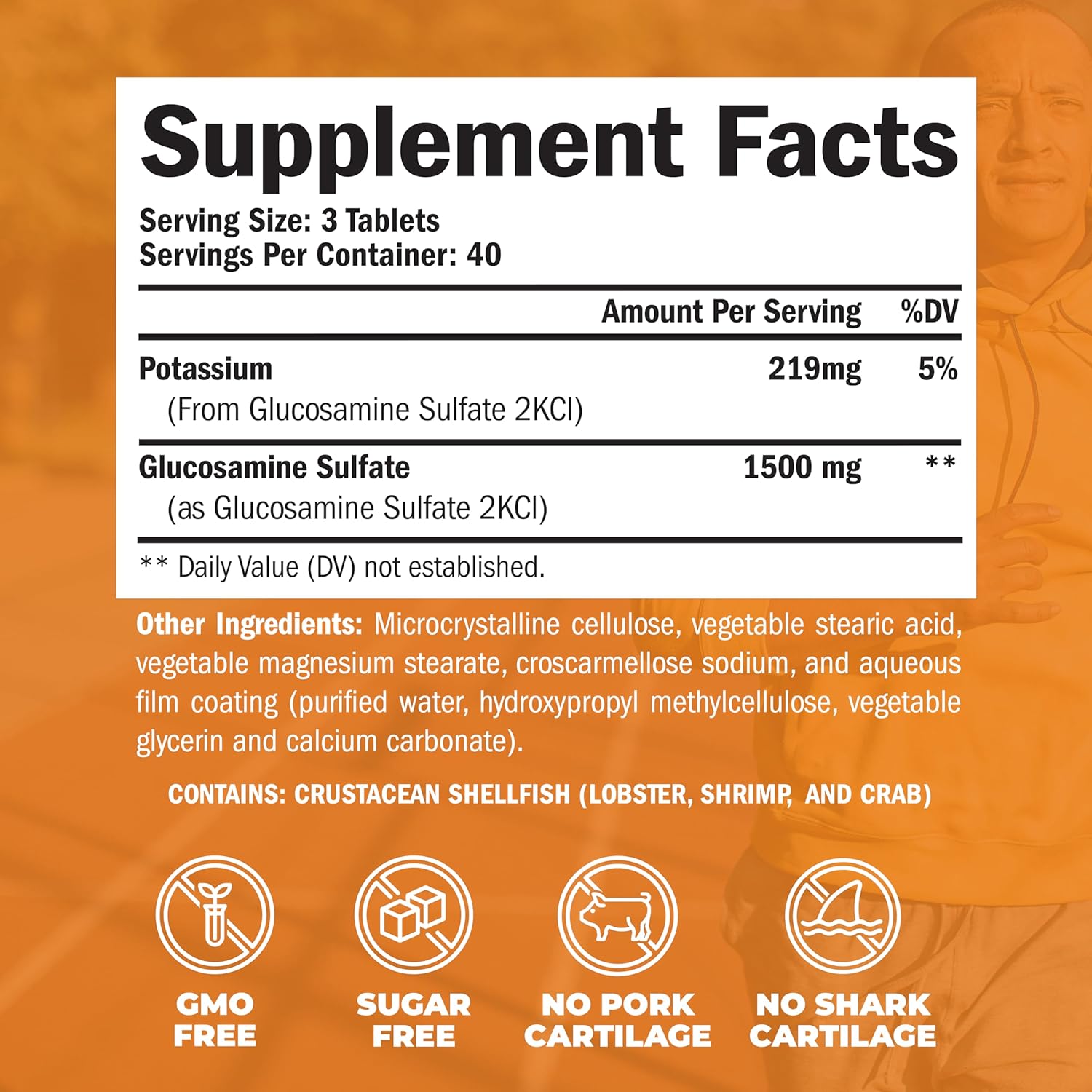 Potassium (From Glucosamine Sulfate 2KCI) 219mg, Glucosamine Sulfate (as Glucosamine Sulfate 2KCI) 1500 mg. Other Ingredients: Microcrystalline cellulose, vegetable stearic acid, vegetable magnesium stearate, croscarmellose sodium and aqueous film coating (purified water, hydroxypropyl methylcellulose, calcium carbonate, polydextrose, magnesium silicate, maltodextrin, and medium chain triglycerides).