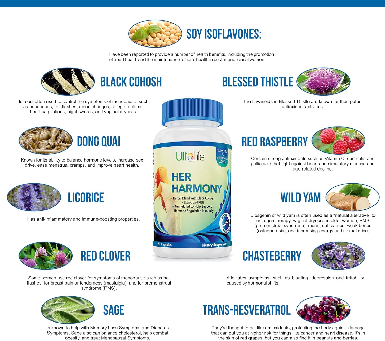 - All Natural Estrogen Free PMS Support - HER HARMONY womens supplements with natural herbs & ingredients - Black Cohosh, Dong Quai, Red Clover provide balancing support and relief for vaginal dryness, PMS & menopause symptoms. Designed to promote natural hormone balance estrogen replacement & overall female wellness. Detox your life from hot flashes & menopausal hormonal imbalances! Try our #1 best natural menopause support pill estrogen free supplement vitamins for women!