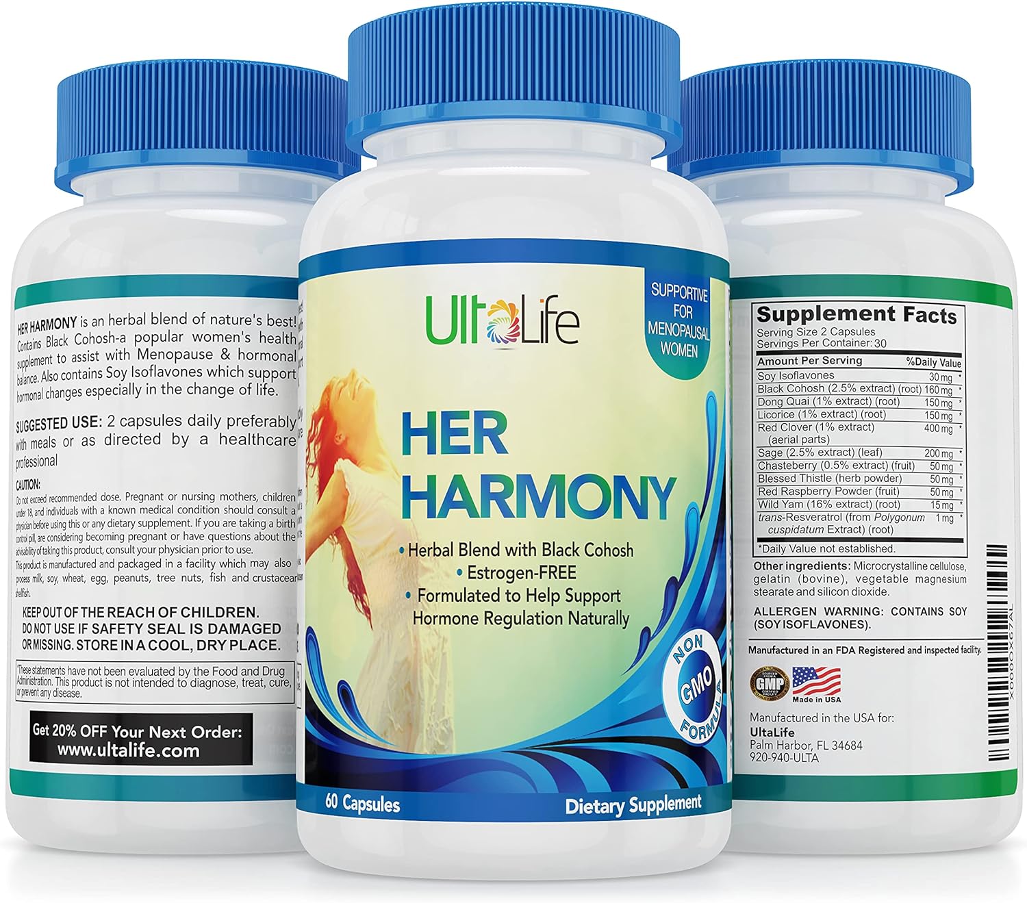 Ultimate Menopause & Perimenopause Support - HER HARMONY pre menopause supplements for women helps symptoms like hot flashes, night sweats, hair and nail changes & sleep. Our premium blend of natural ingredients provide a holistic approach to hormone stability for women, promoting well-being thru transitional periods. Feel confident, happy & comfortable relief - Test HER HARMONY complex vitamins today! ULTALIFE'S estrogen support supplements - a prehormone support balance for women.